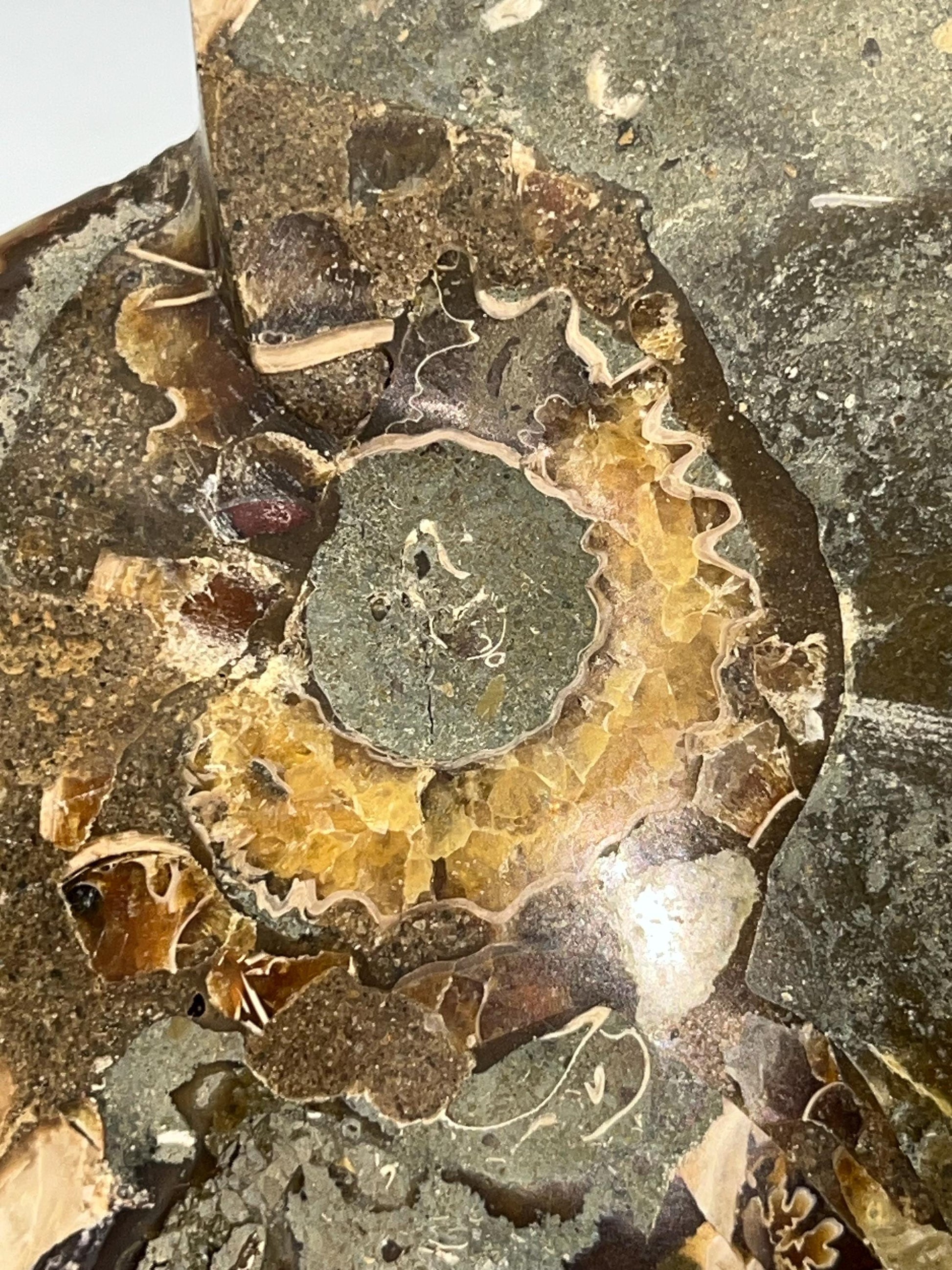 A fossilized Ammonite spiral-shell from Morocco with Honey Calcite, Quartz and Opal inclusions. You can see the Calcite and Quartz inclusions in the chambers of the shell itself, the opal you will catch beautiful fiery red hues on the rear of the shell along with some stunning icy blue streaks too. These are best seen when a direct light is shining on the shell. You will get a lot of enjoyment finding spots of Opal that you didn’t previously see as some are in more obvious places than others.