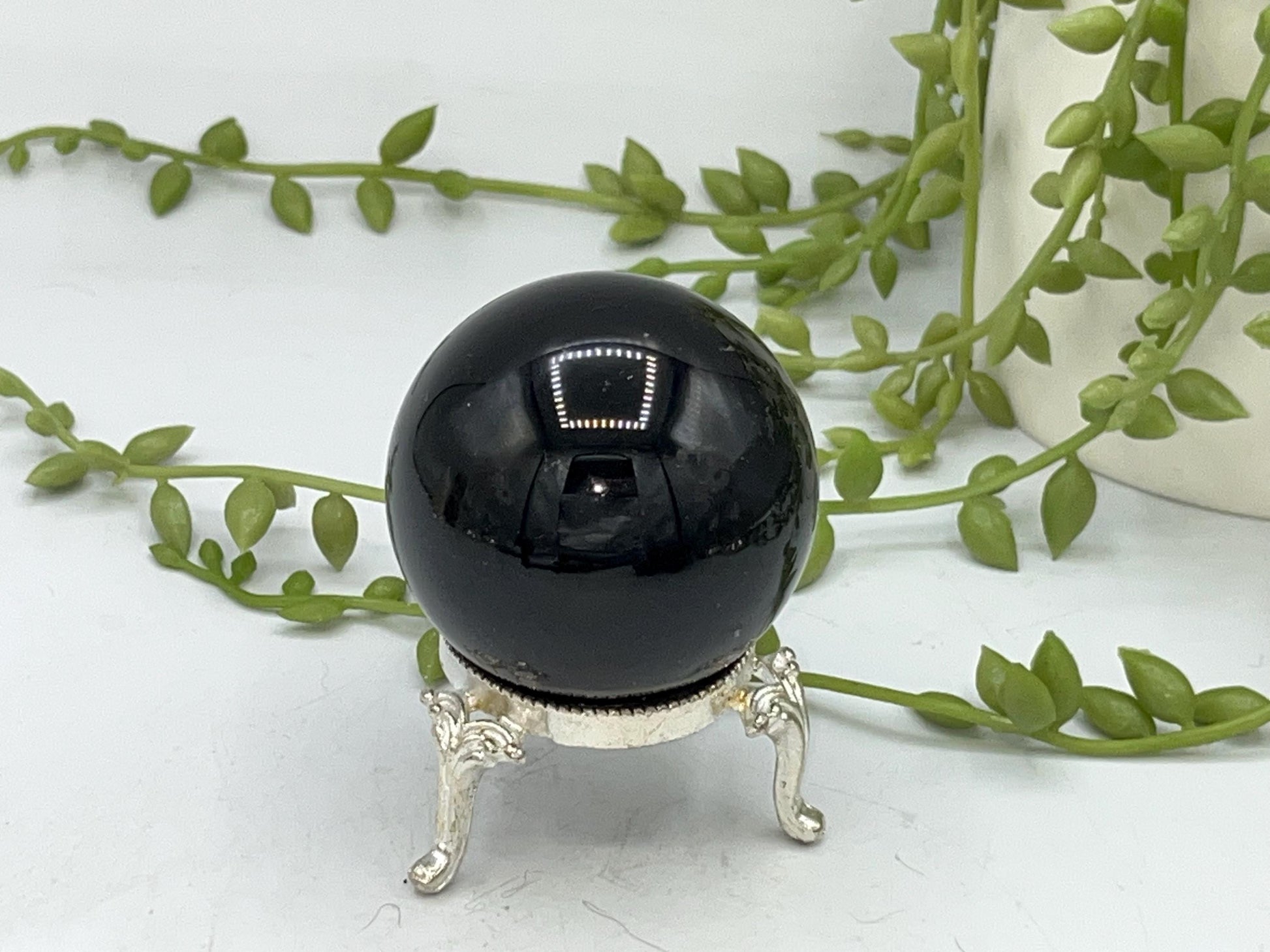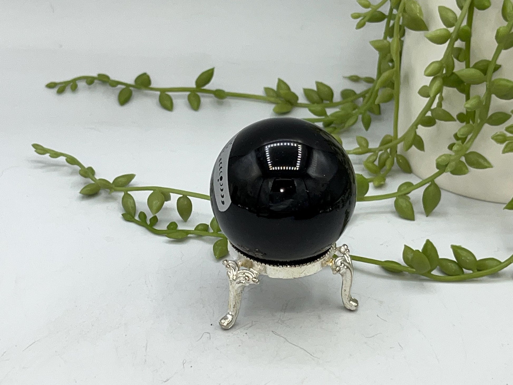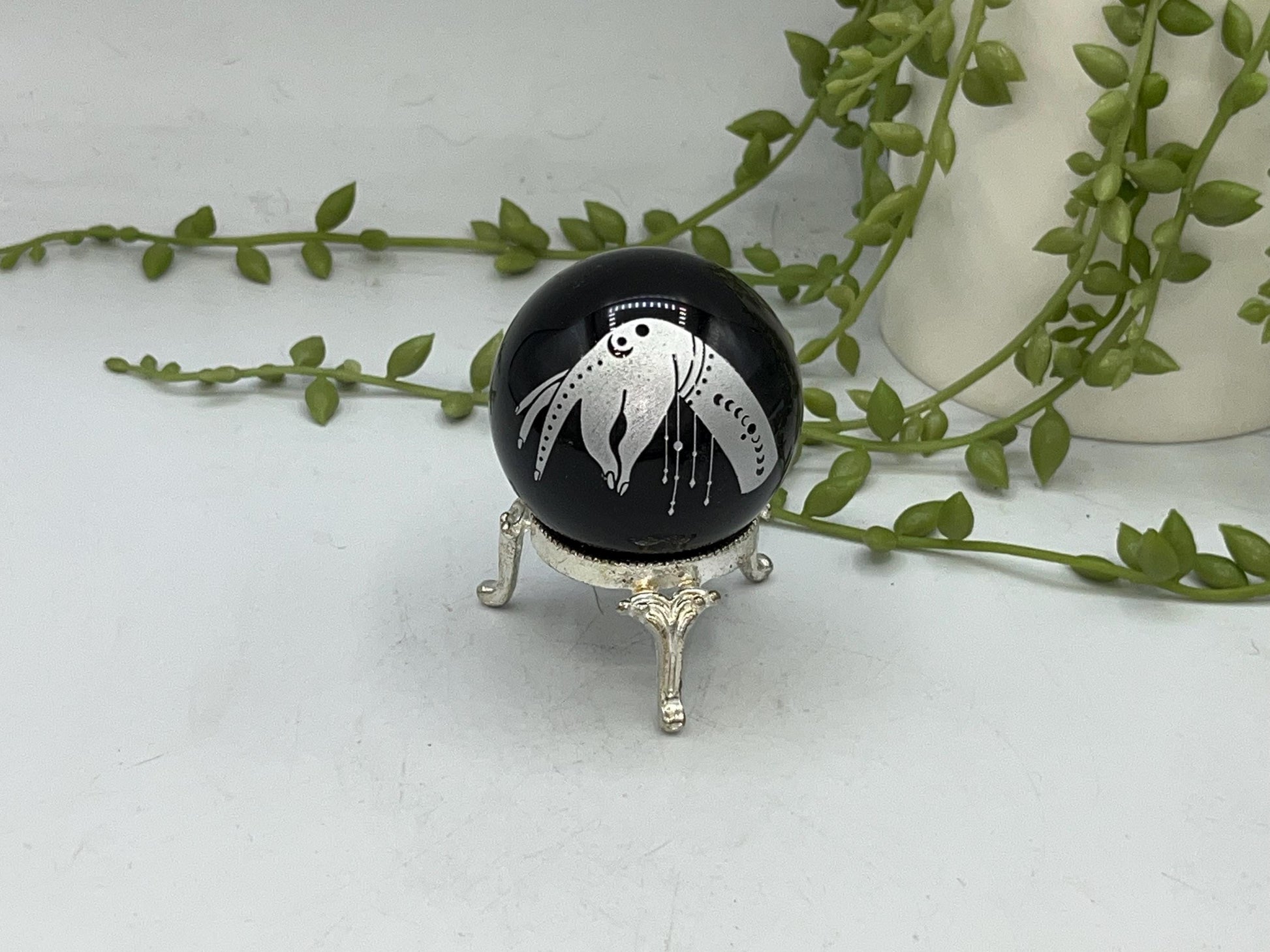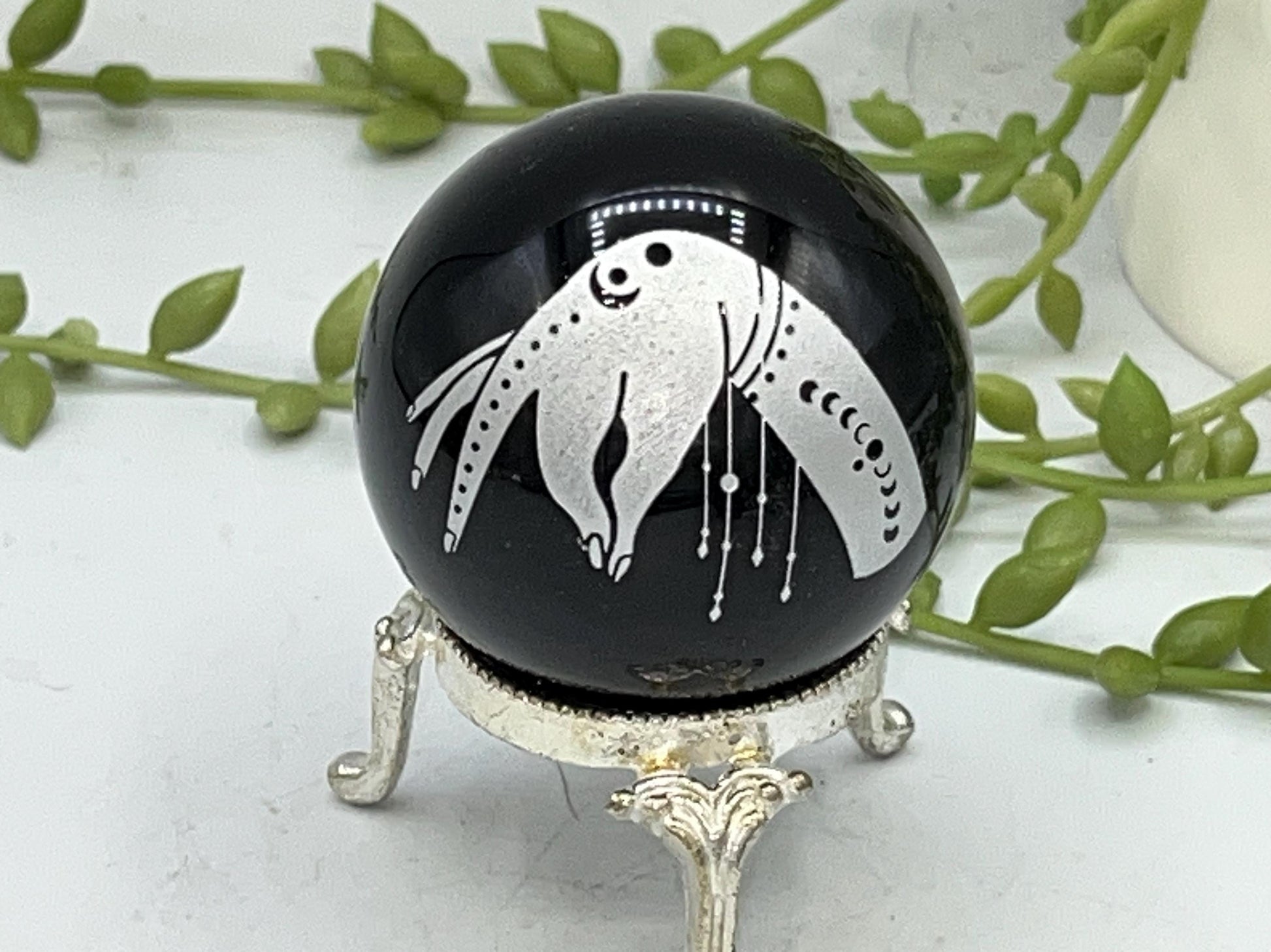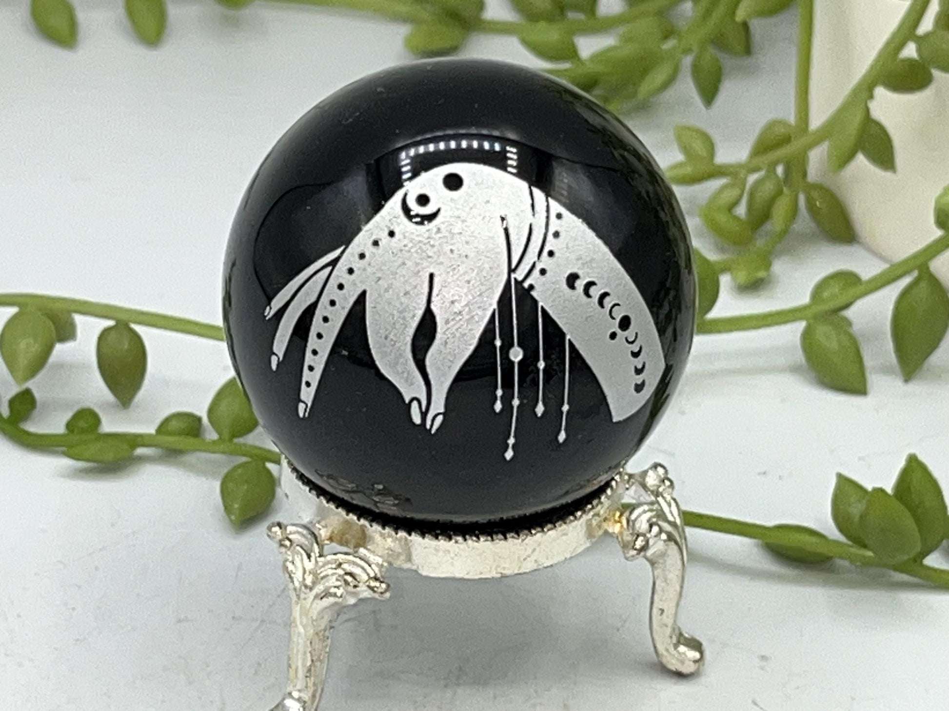 An elegant Black Obsidian sphere that has been engraved with a mystical celestial hand pattern with a moon phase design on the arm and hand in a metallic silver colour. The sphere measures approximately 49mm and is around 157 grams in weight.