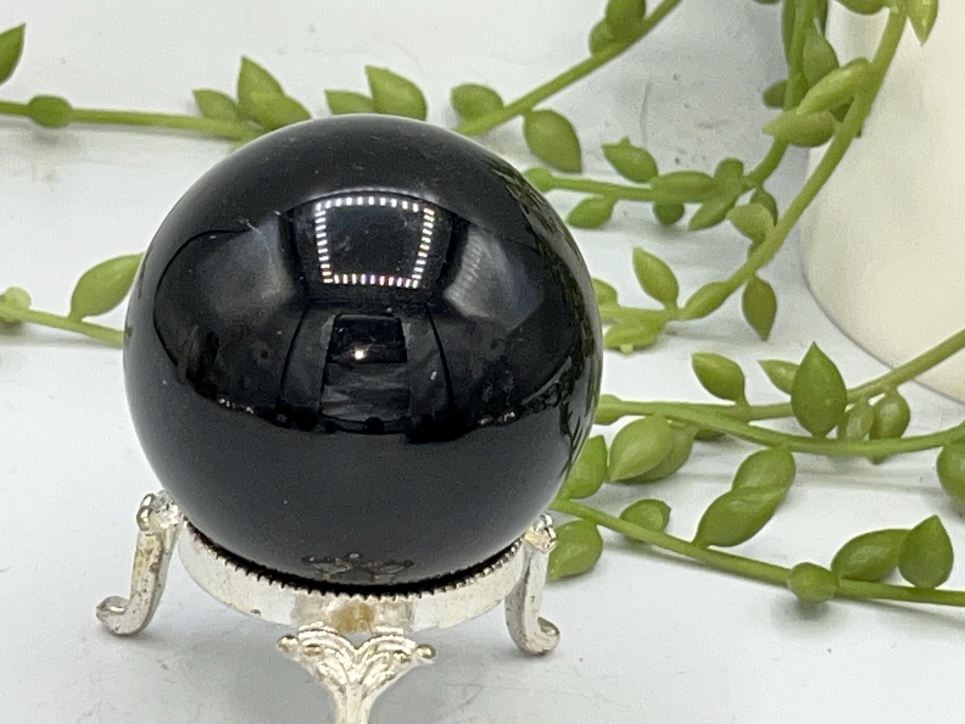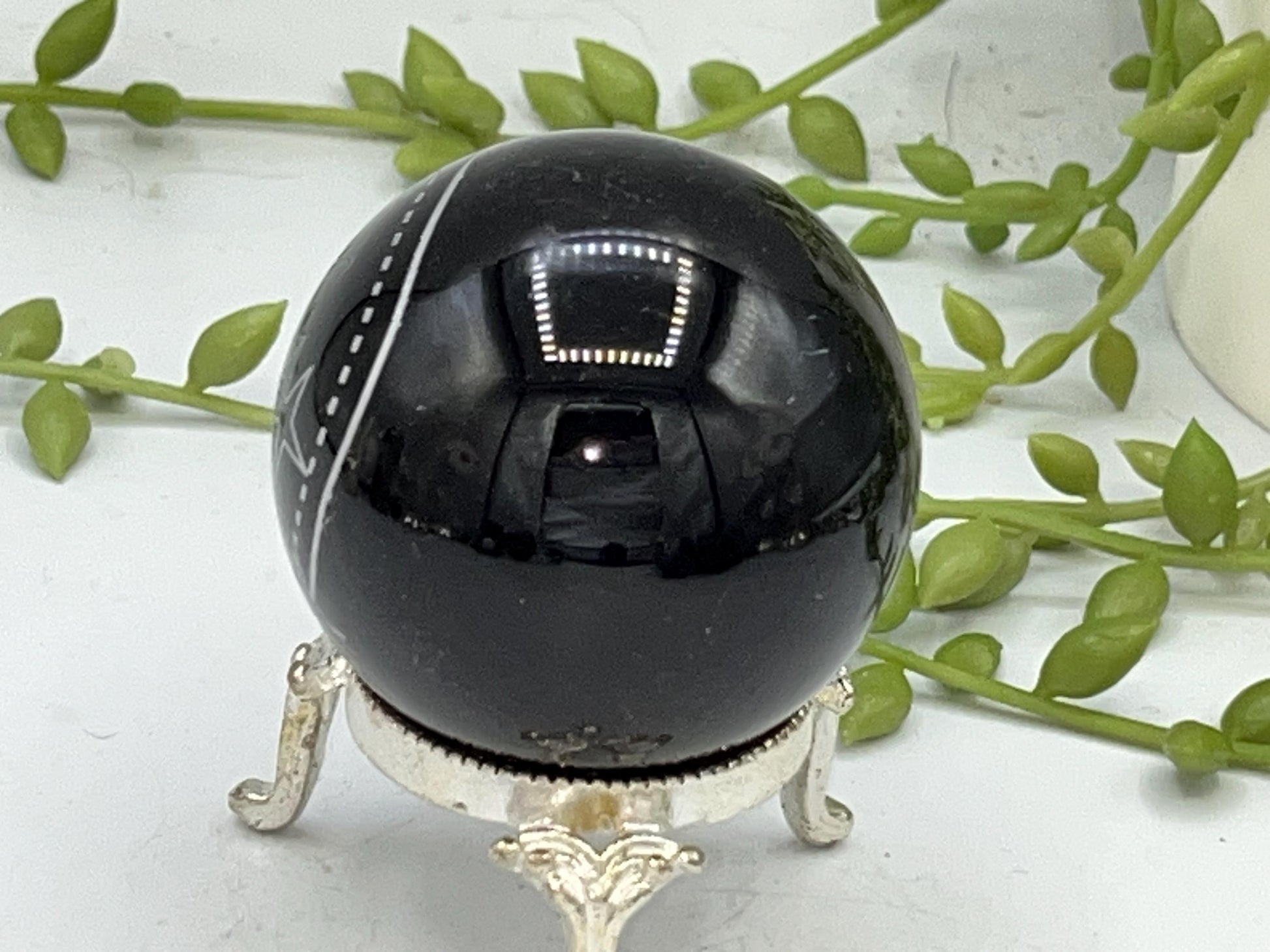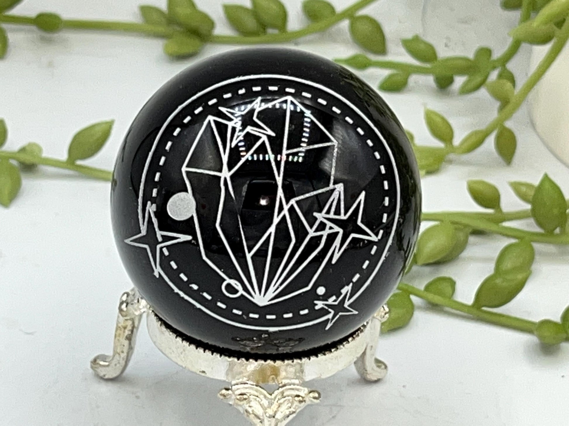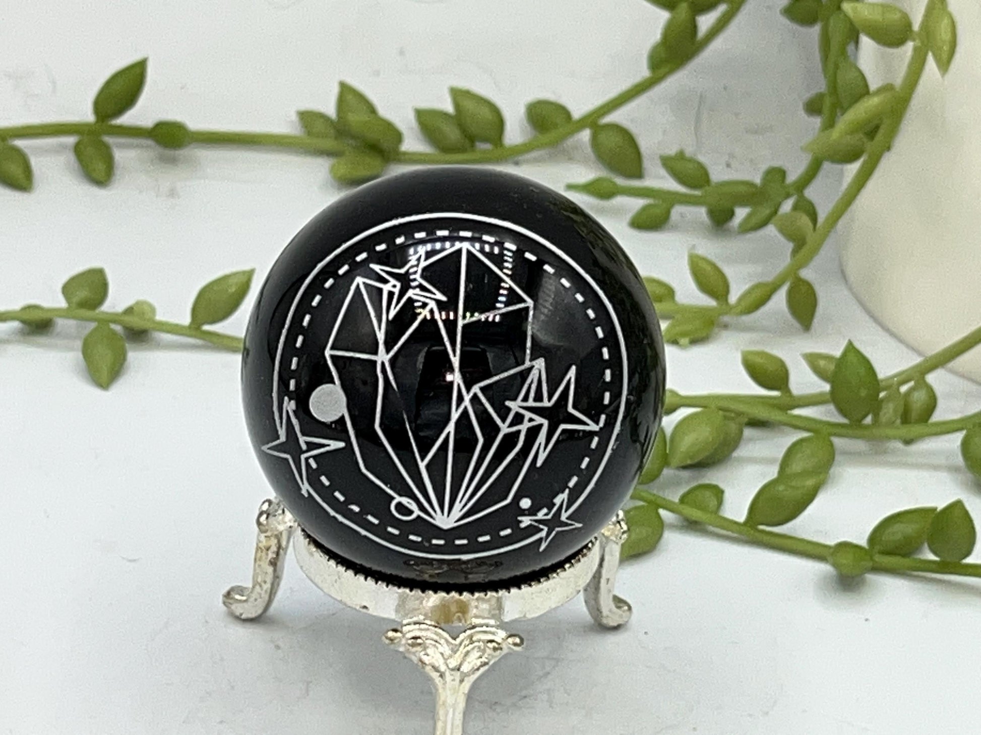 An elegant Black Obsidian sphere that has been engraved with a pretty crystal cluster and star design on the front, finished in a metallic silver colour. The sphere measures approximately 49mm and is around 157 grams in weight.
