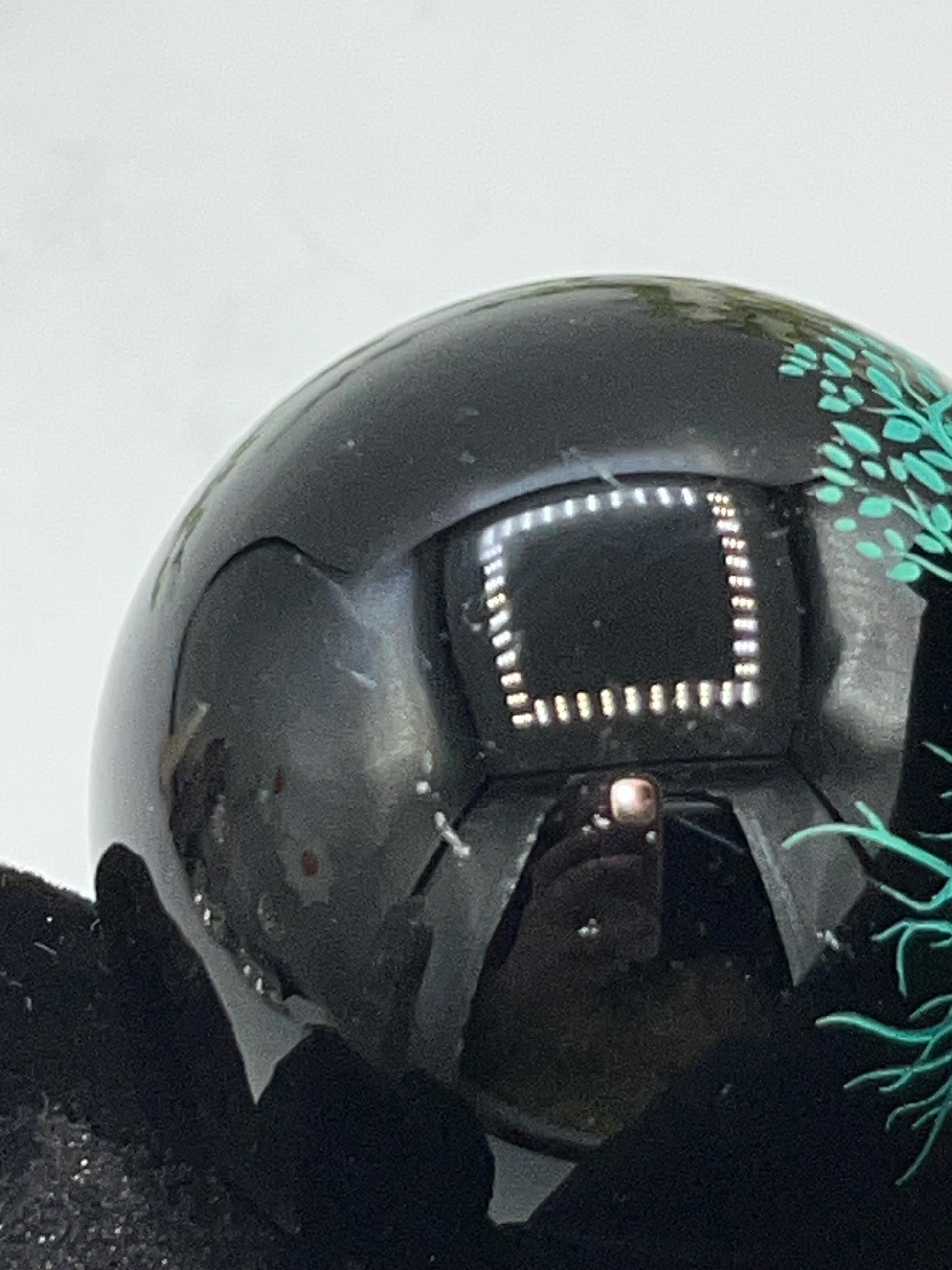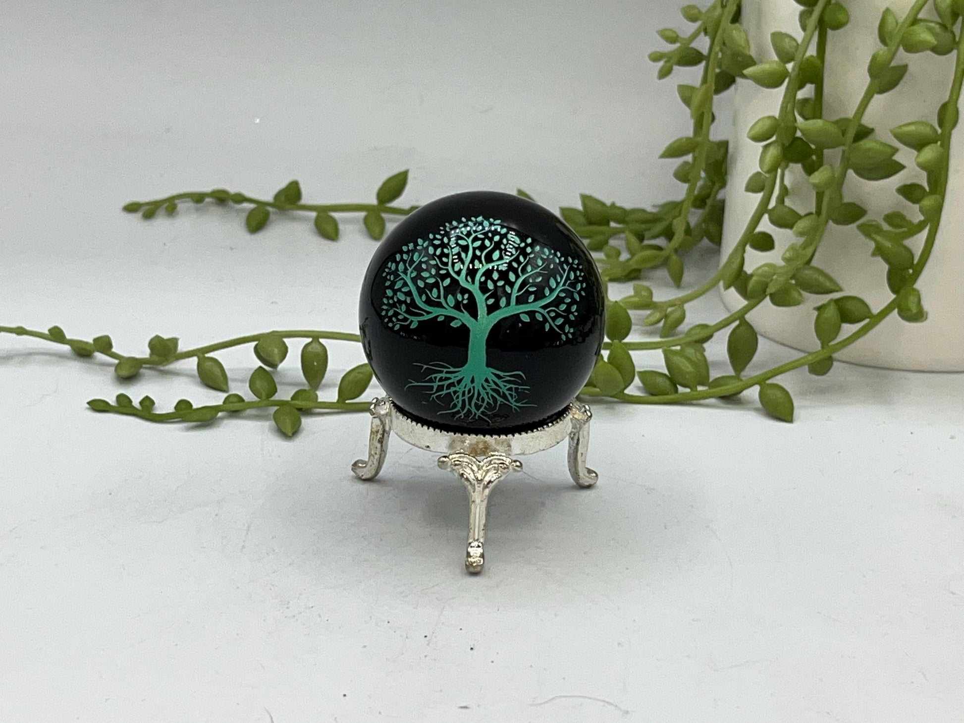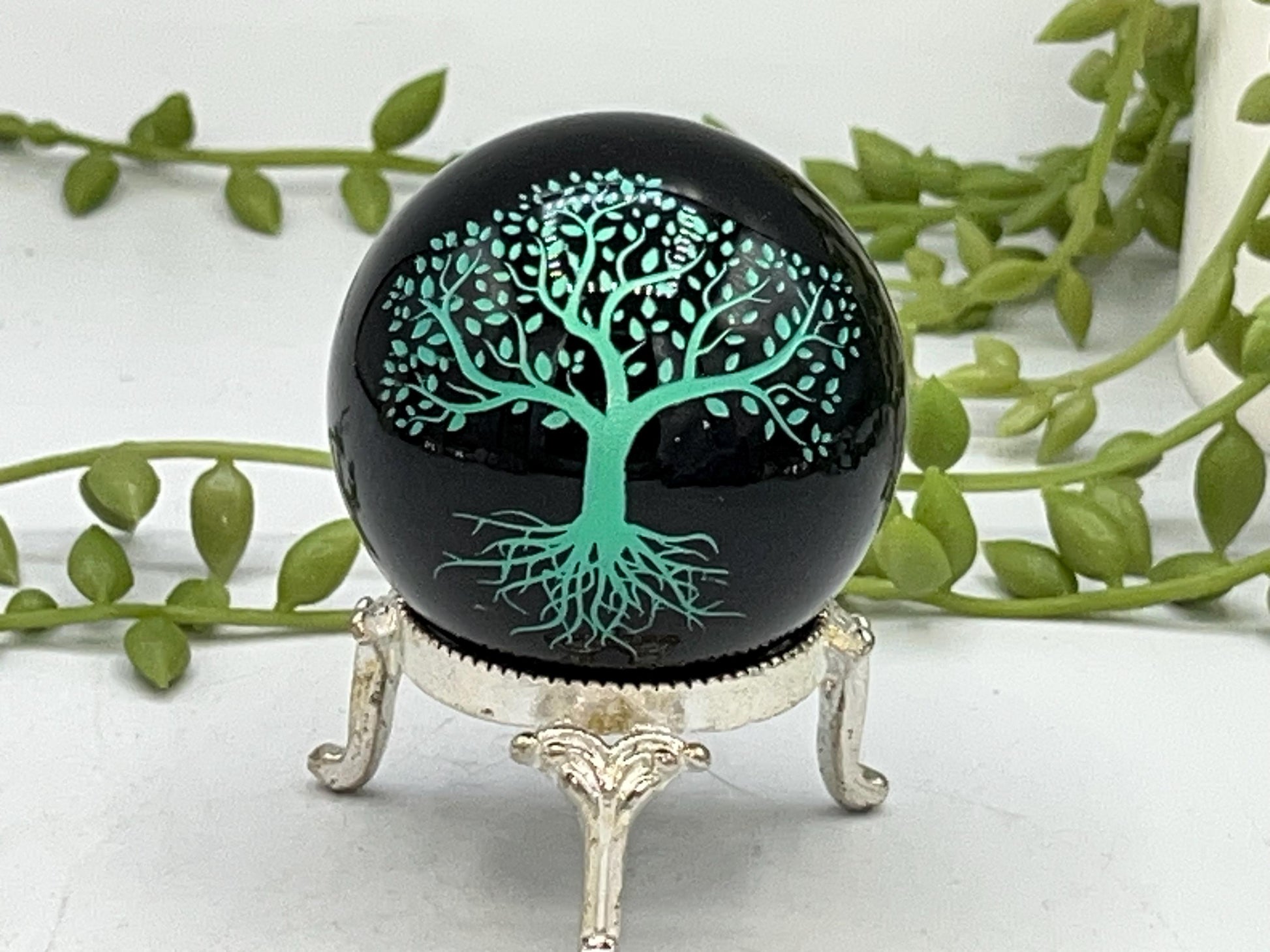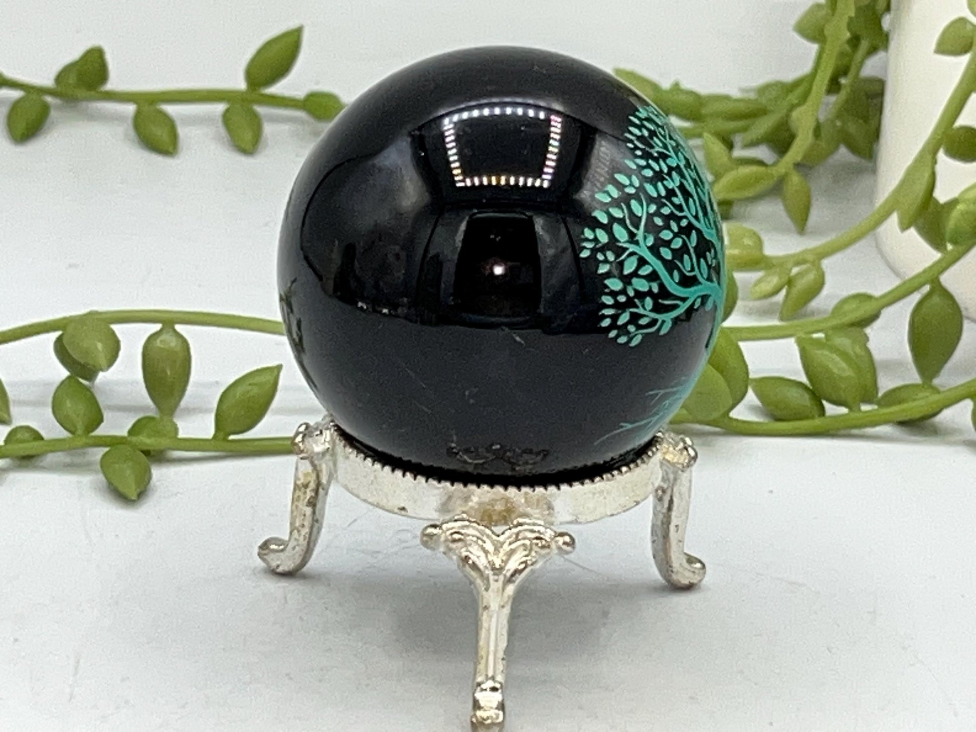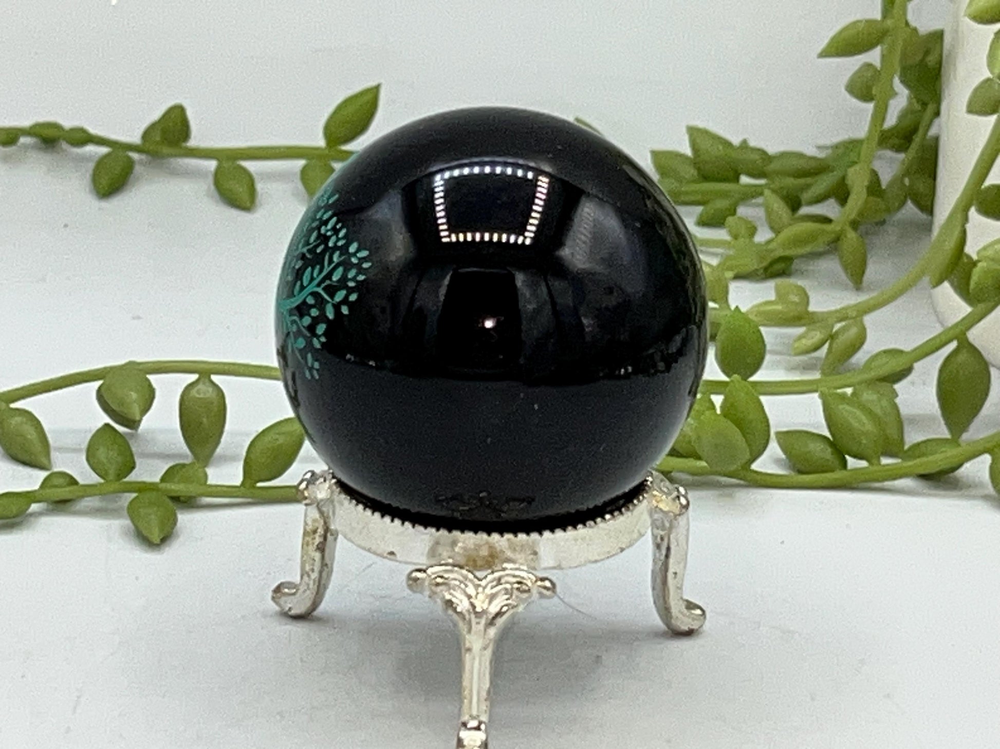 Black Obsidian Sphere with a metalic green tree of life design engraved. Crystal Spheres, home decor, Birthday Gift
