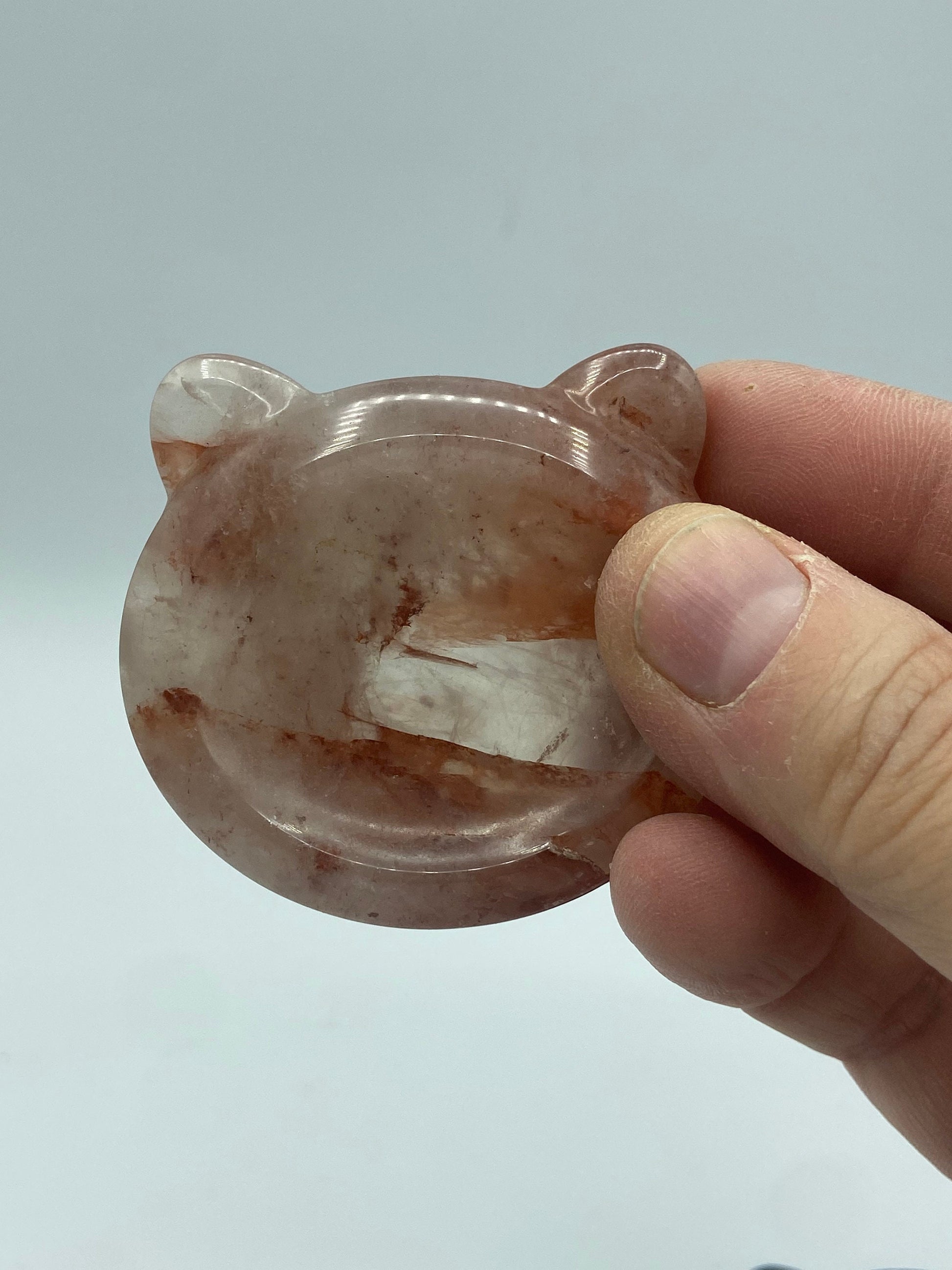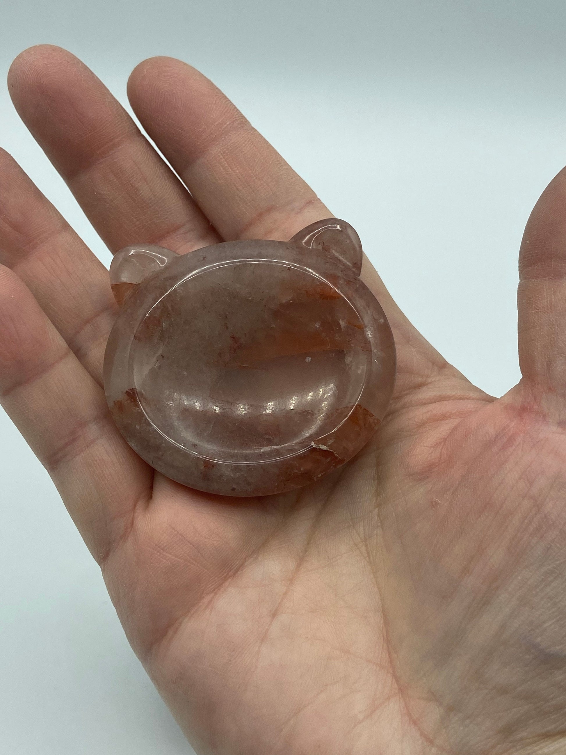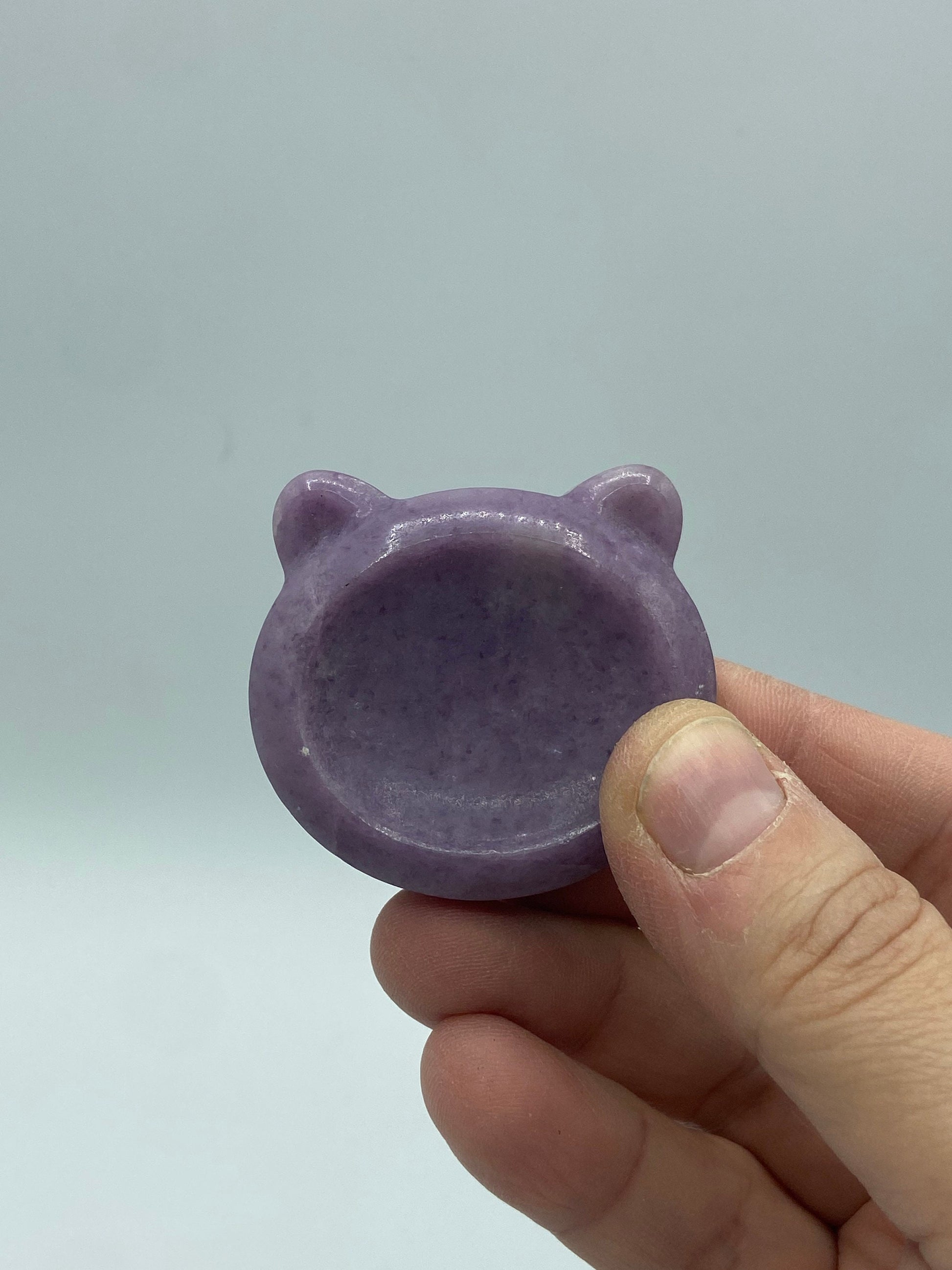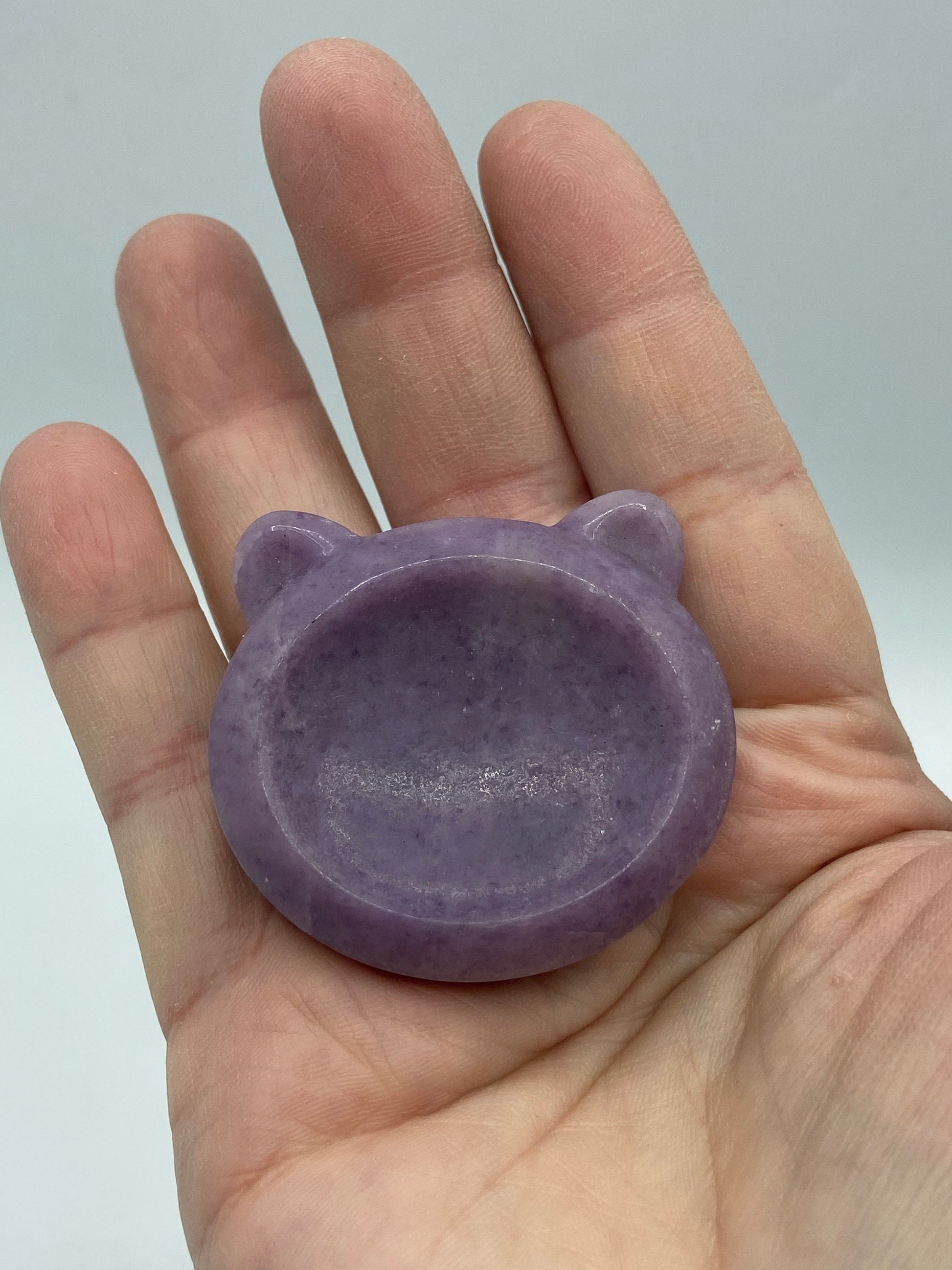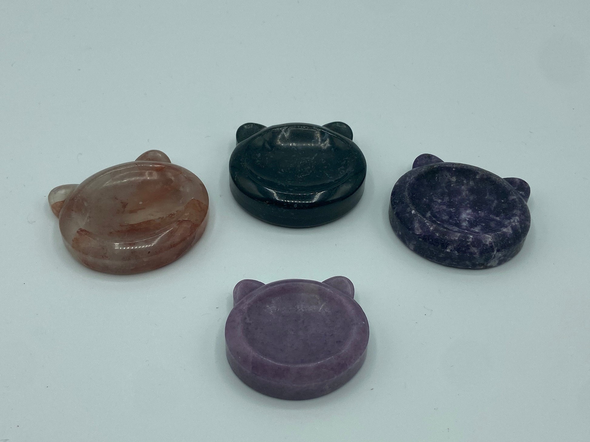 A selection of gorgeous cat shaped carved bowls. Various materials including, fire quartz, 2 colours of lepidolite and moss agate available.