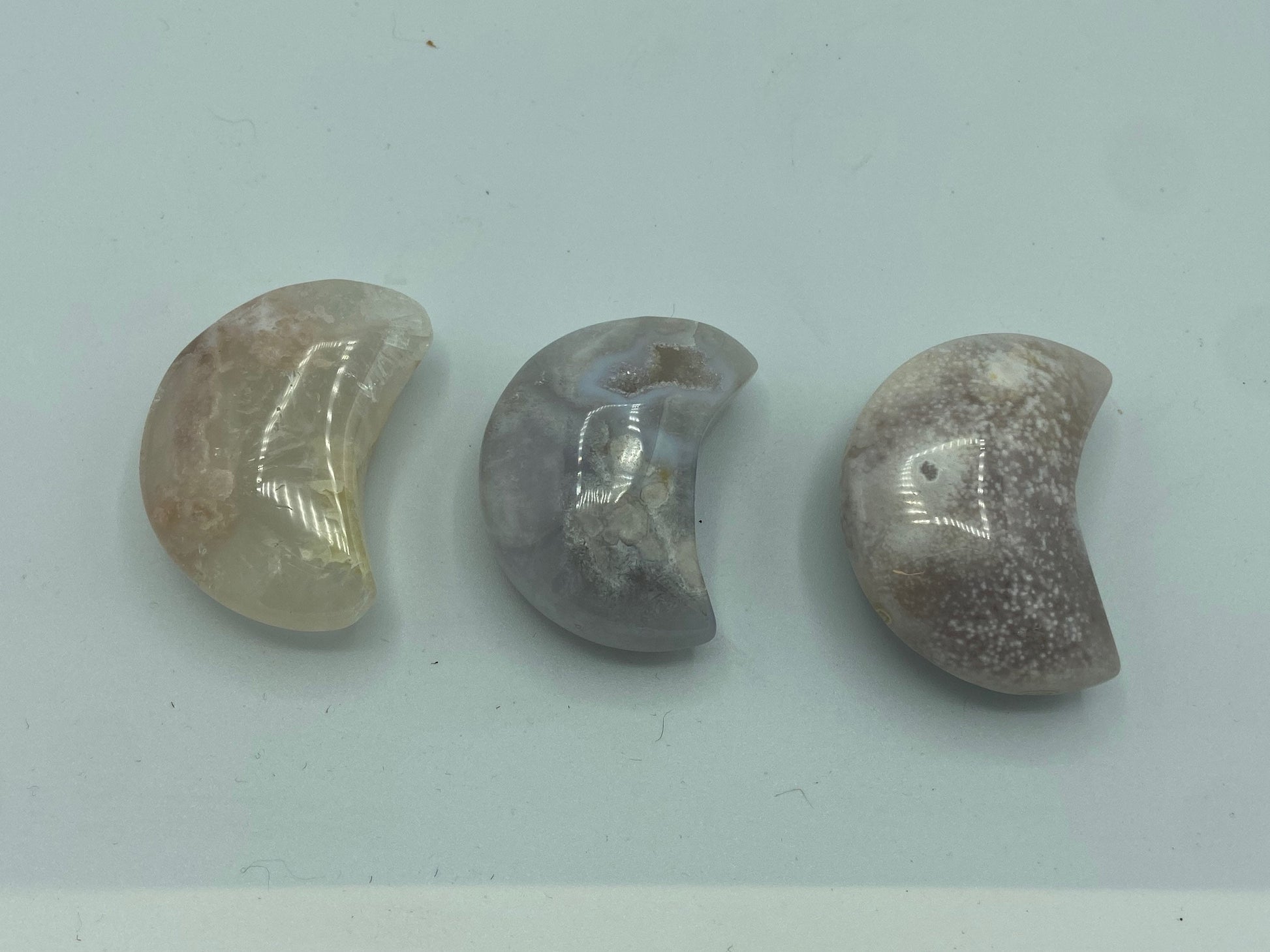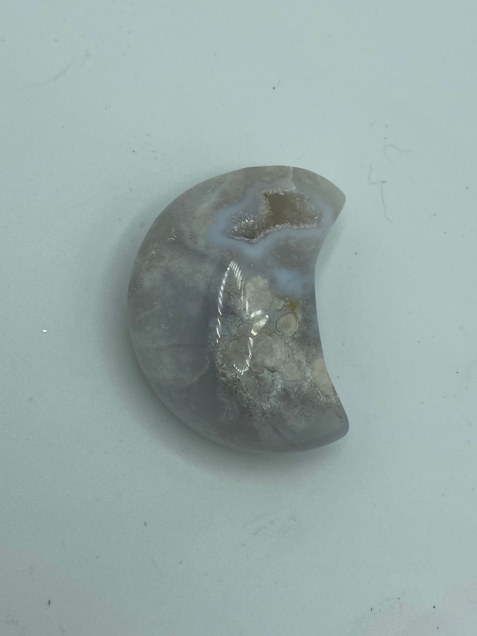 Flower Agate, also known as Cherry Blossom, is a type of Agate with opaque Chalcedony inclusions that resemble tiny floral formations. The stone is mainly has either light pink/lilac/blue hues with white “flower” inclusions. Some may have druzy areas that are natural to the stone that may not be picked up on camera. The patterns vary on each moon carving, so select what calls to you.