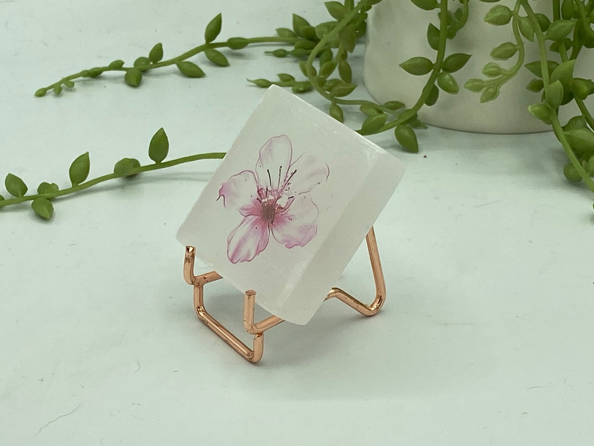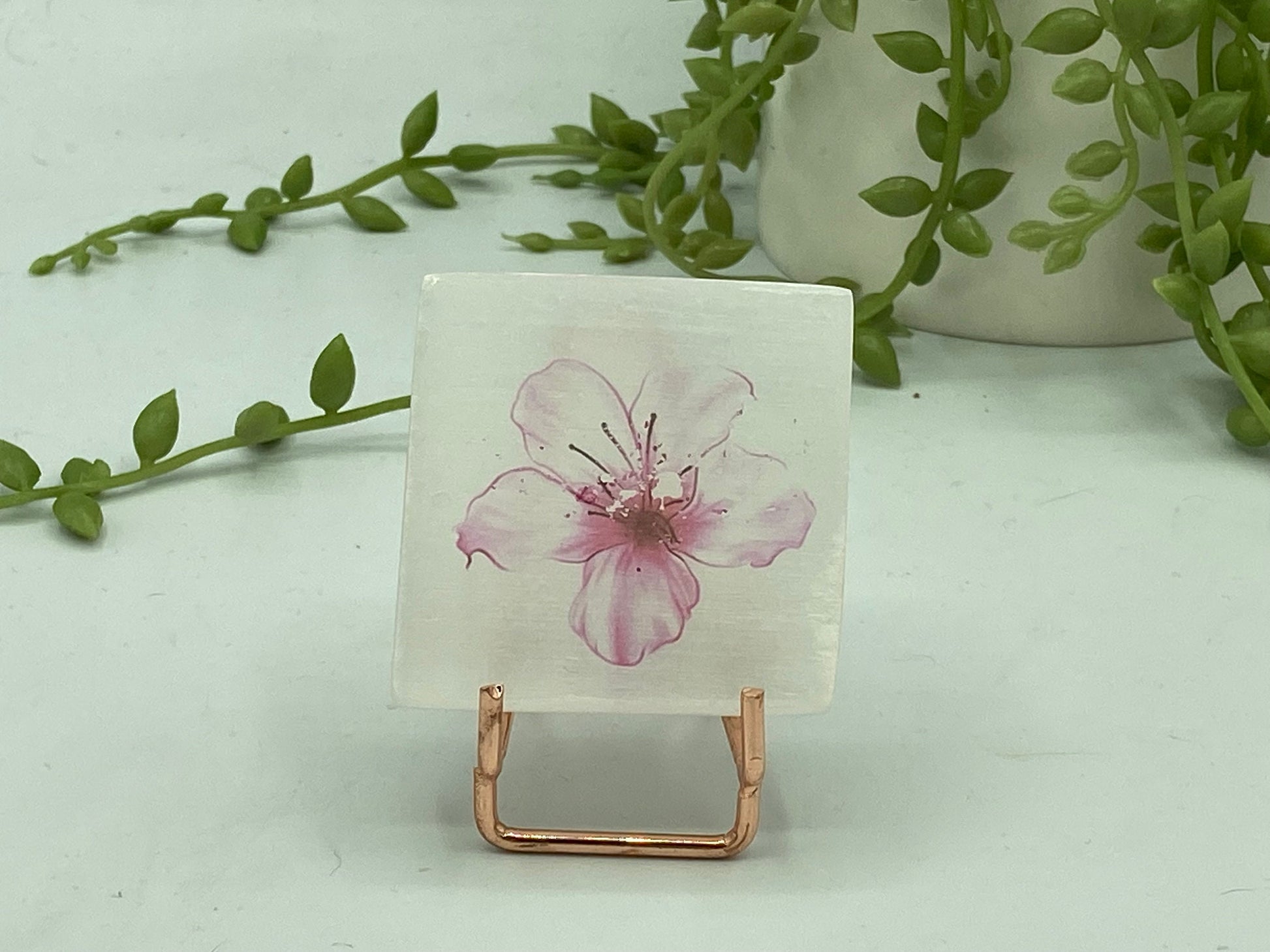 Absolutely gorgeous miniature charging plates featuring a lovely pink hibiscus flower picture, handmade selenite design that is approximately 55mm in diameter and 6-8mm thick.