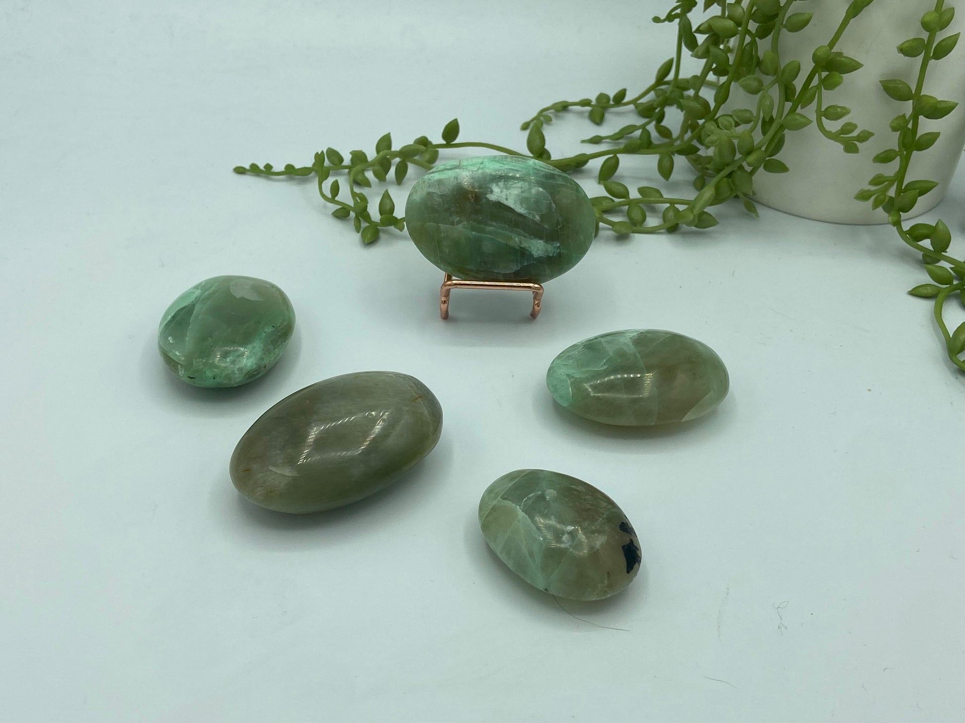 This stunning Green Moonstone palm stone displays gorgeous mint green hues amidst dark greens, and a shimmering inner glow which sometimes manifests in mesmerising flashes of blue and silver light.
