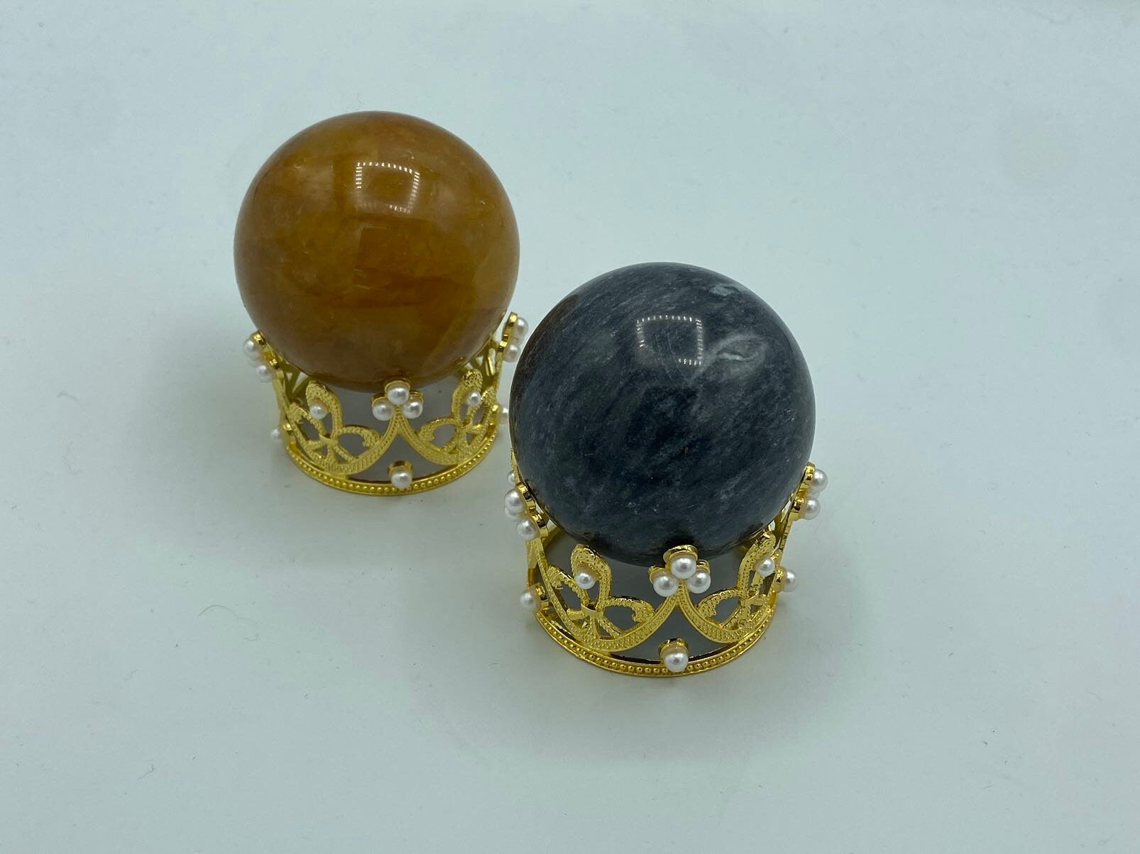 A gorgeous gold coloured sphere stand with pearls adorned around the points. Ideal for large spheres 6cm and above.