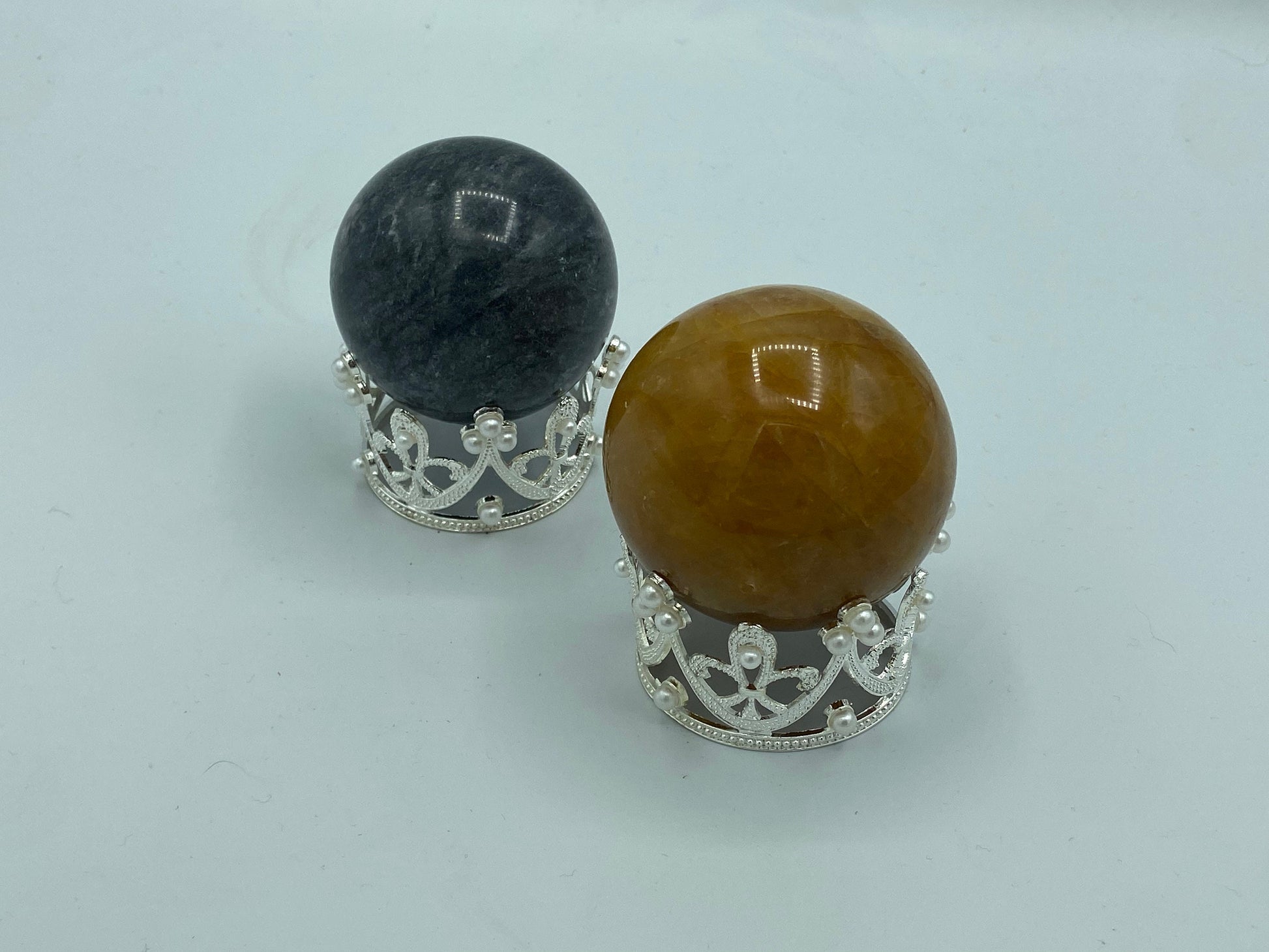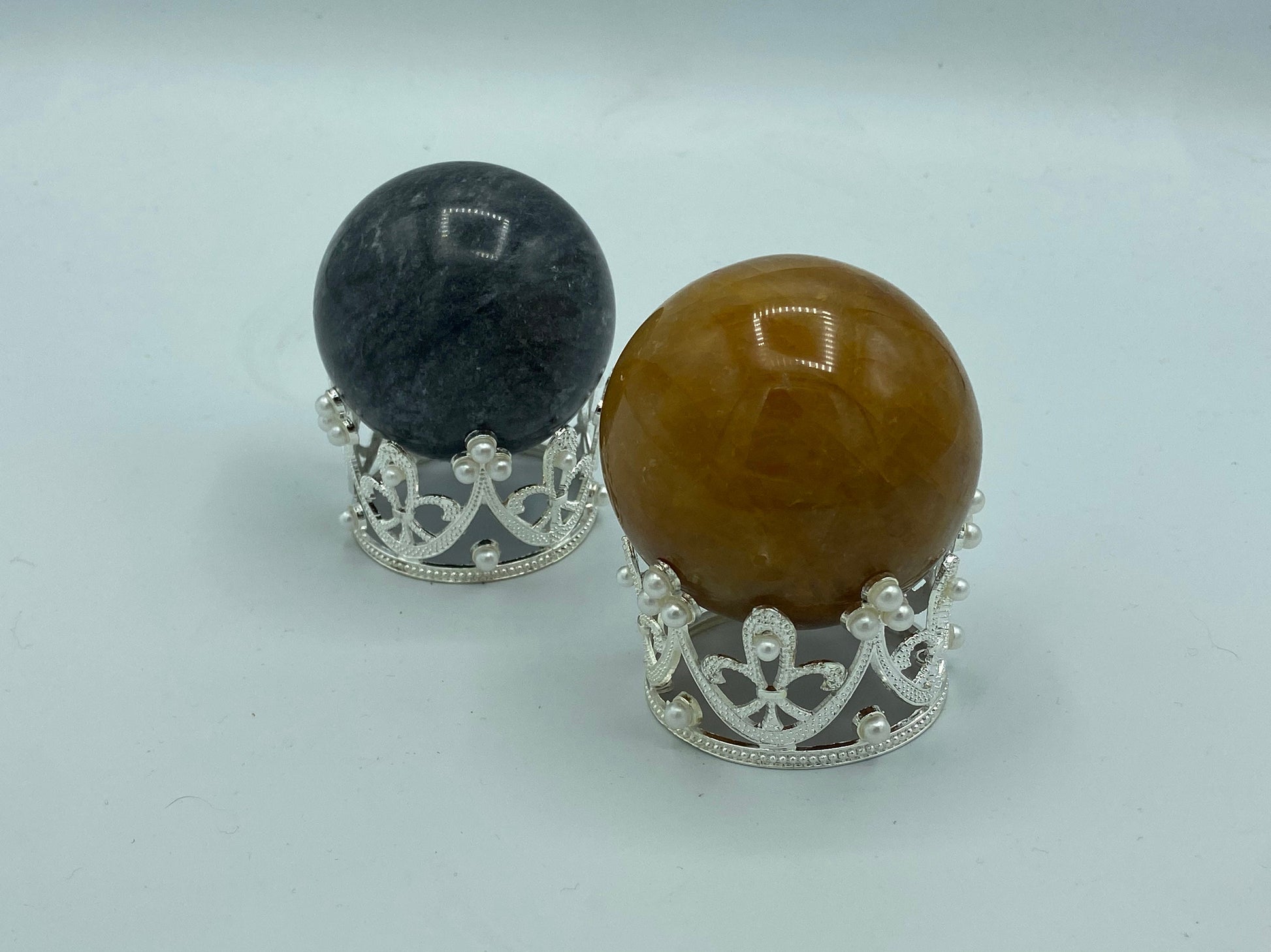 A gorgeous silver coloured sphere stand with pearls adorned around the points. Ideal for large spheres 6cm and above.