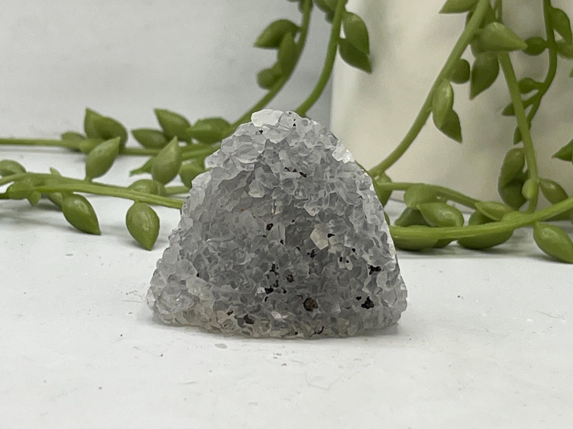 A beautiful mini amethyst cathedral in cool, grey tones. This particular piece has lots of gorgeous dark black Iron inclusions dotted all over the surface of the crystal. This piece comes from Brazil.
