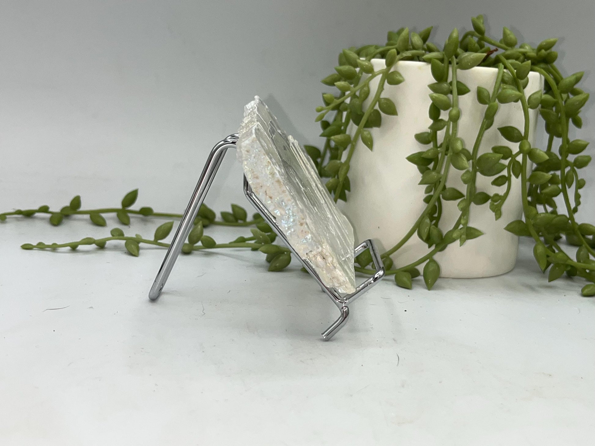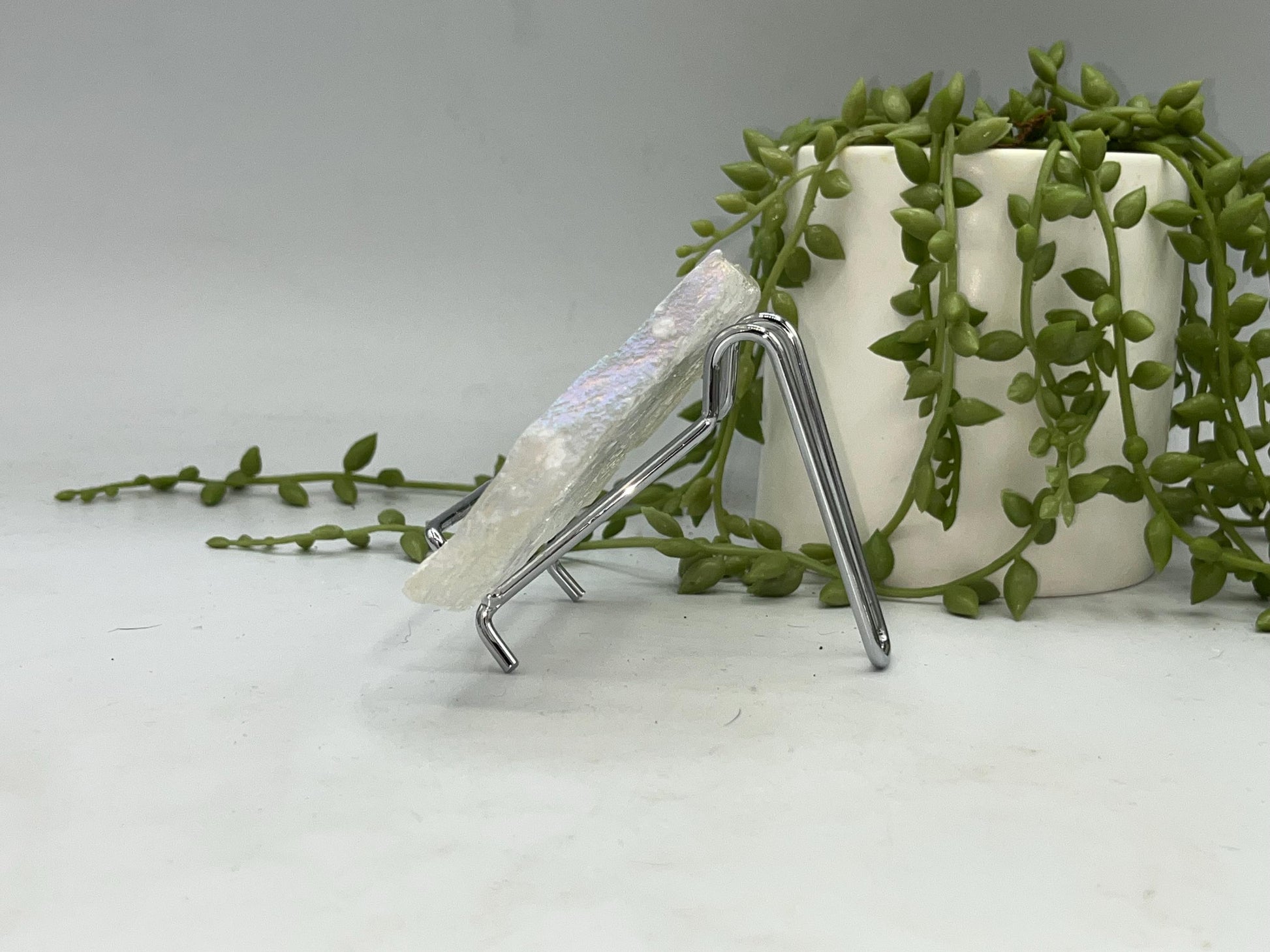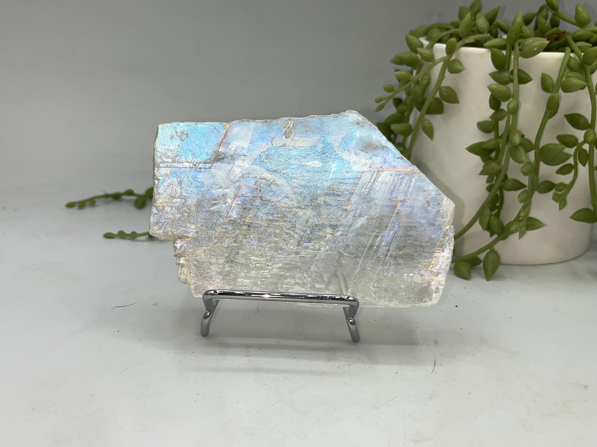 This amazing Aura Selenite slab is a stunning ice-clear plate which was custom coated just for Hocus Crocus Creates. Angel aura is a treatment of platinum, silver, and gold bonded to the surface of the Selenite. This treatment enhances the peaceful, illuminating properties of selenite, adding a layer of major metaphysical power. Angel aura healing properties are quite remarkable. It stimulates the immune system, balances the body’s mind and soul, and strengthens your energy level. Aura crystals are generally used for higher vibrational energy work/shadow work. Angel aura selenite stimulates both body and spirit through its powerful vibrations. This treatment alone facilitates communication and connection with the ethereal realms, spirit guides, and also connects us to our past lives.