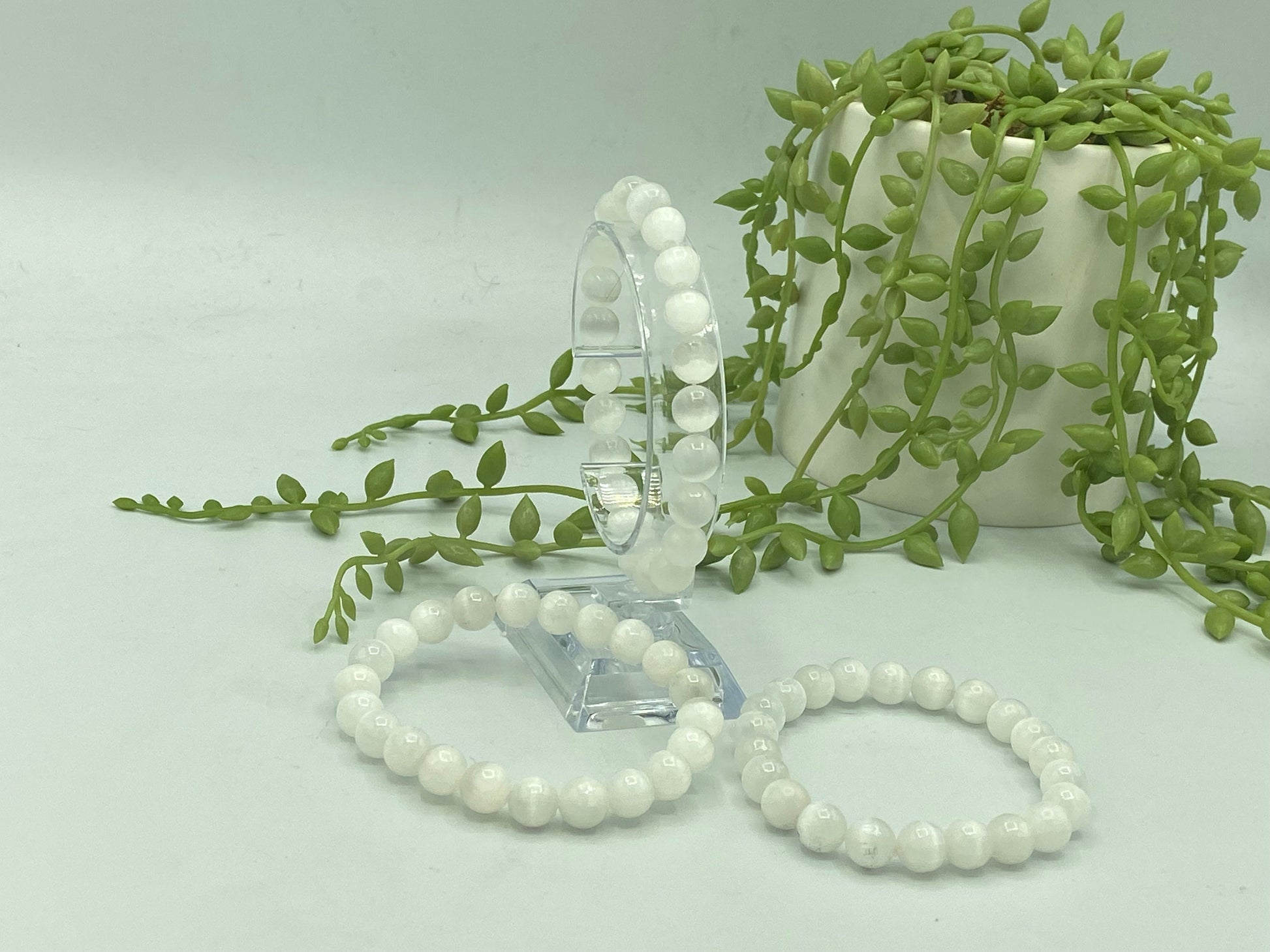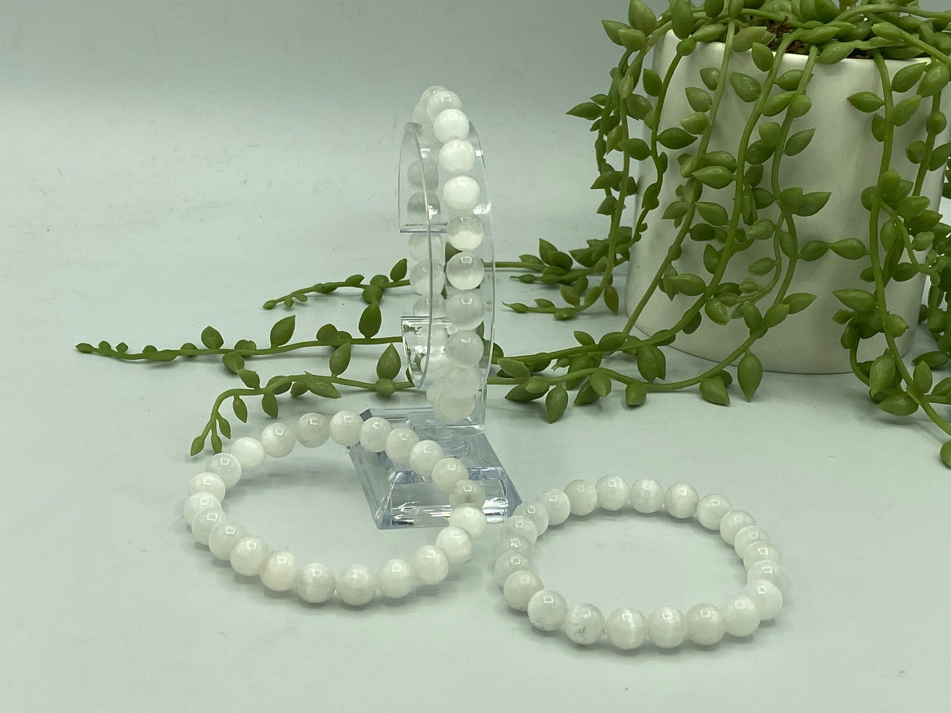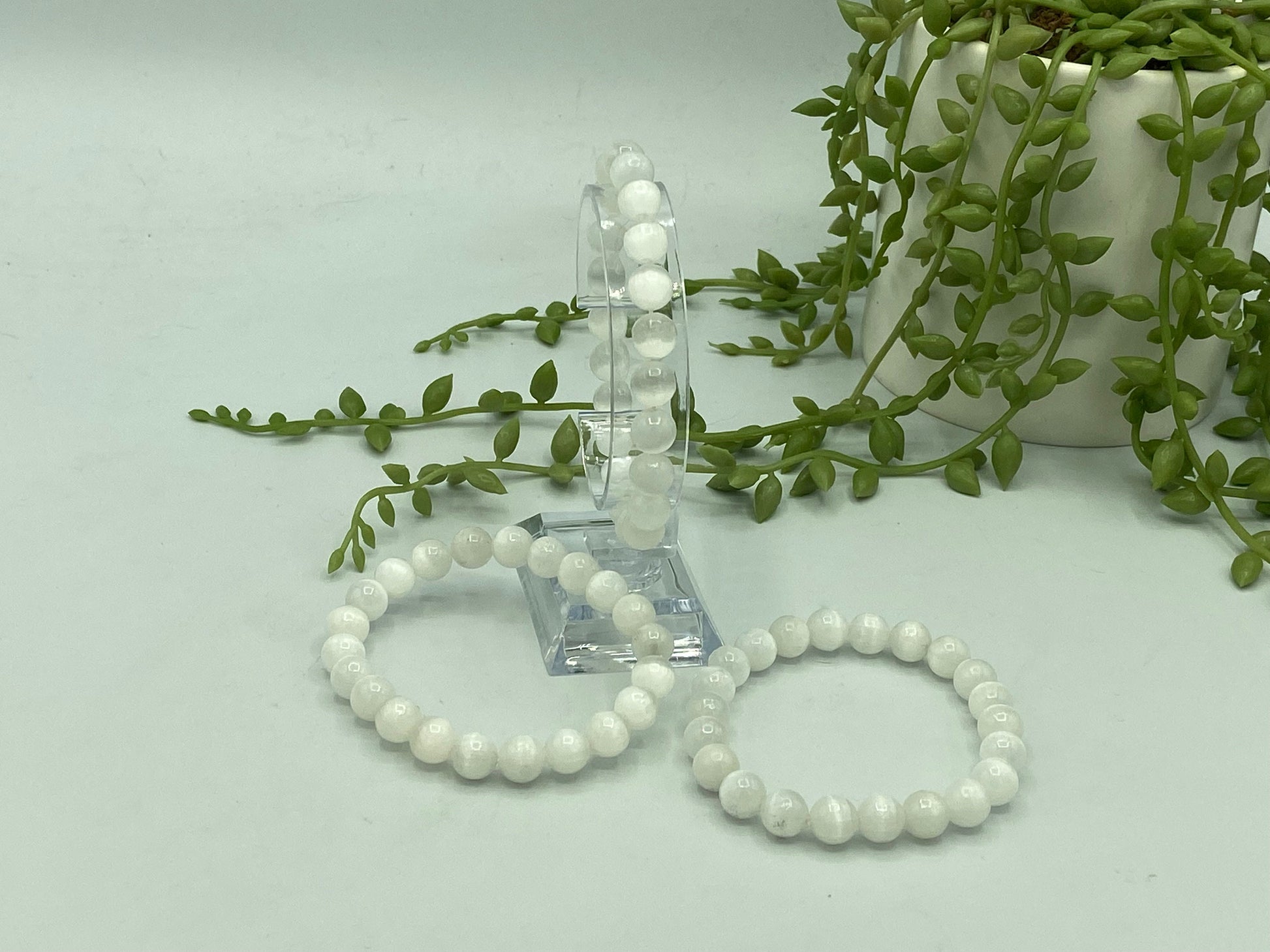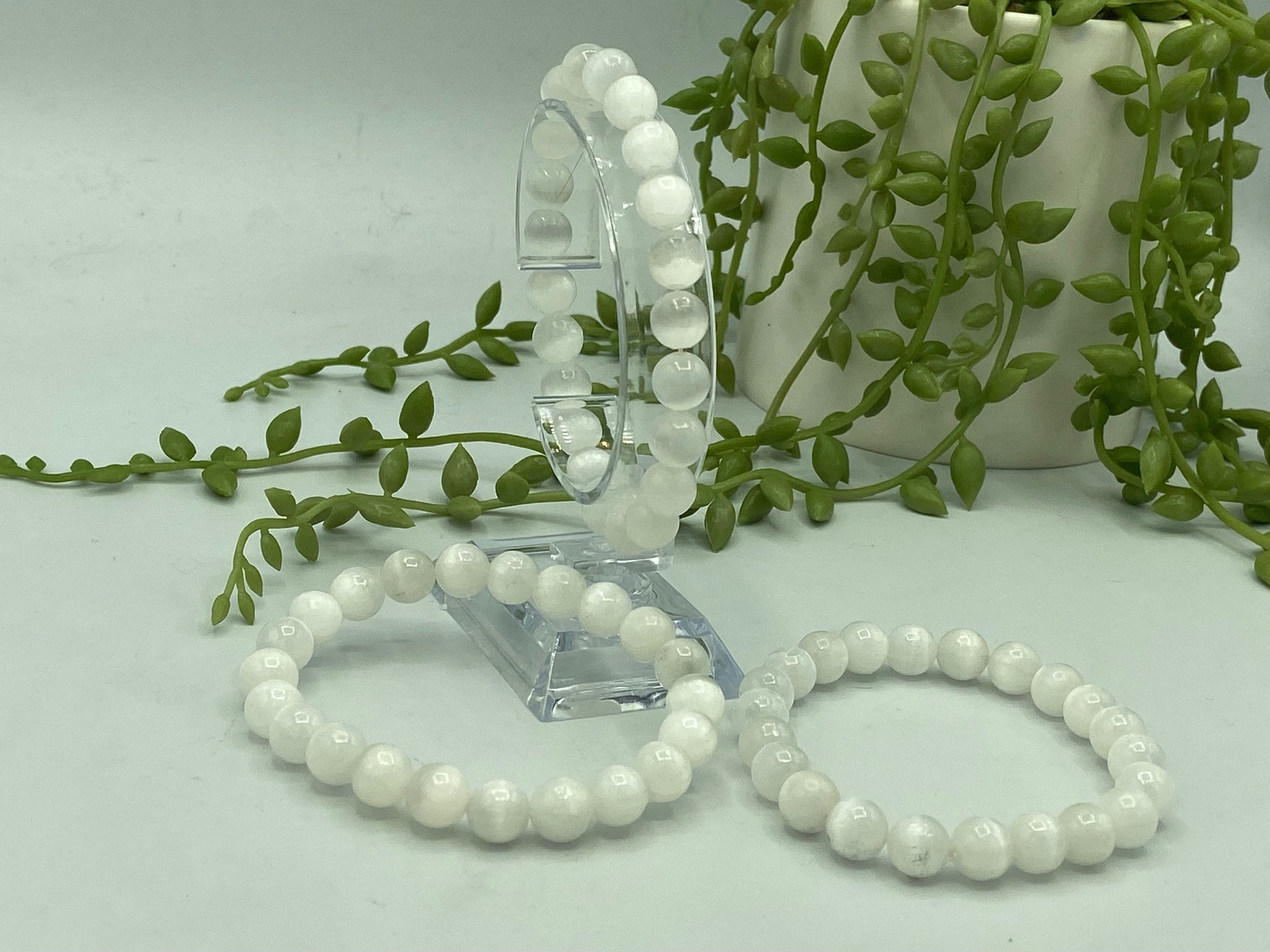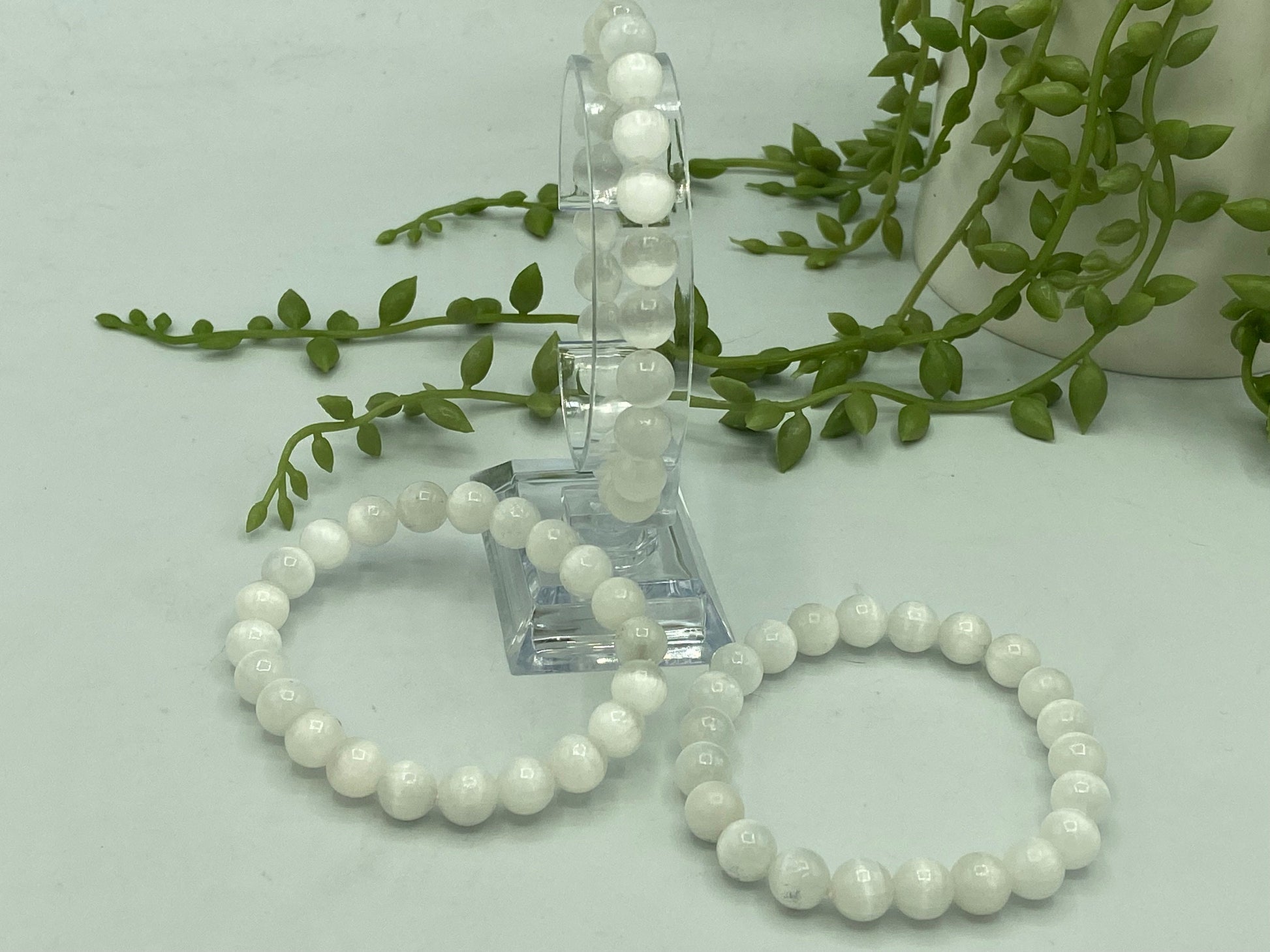 Satin spar/Gypsum Stone Bracelet also more commonly known as selenite, elastic bracelet to fit any wrist, White Selenite/satin spar 8mm beaded bracelet.