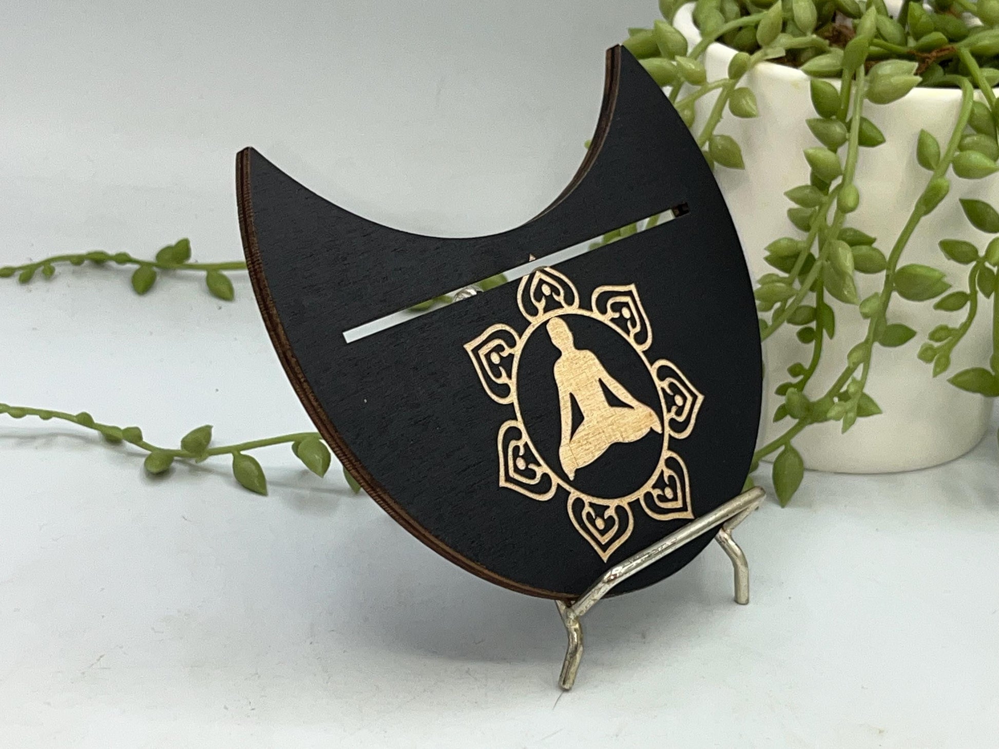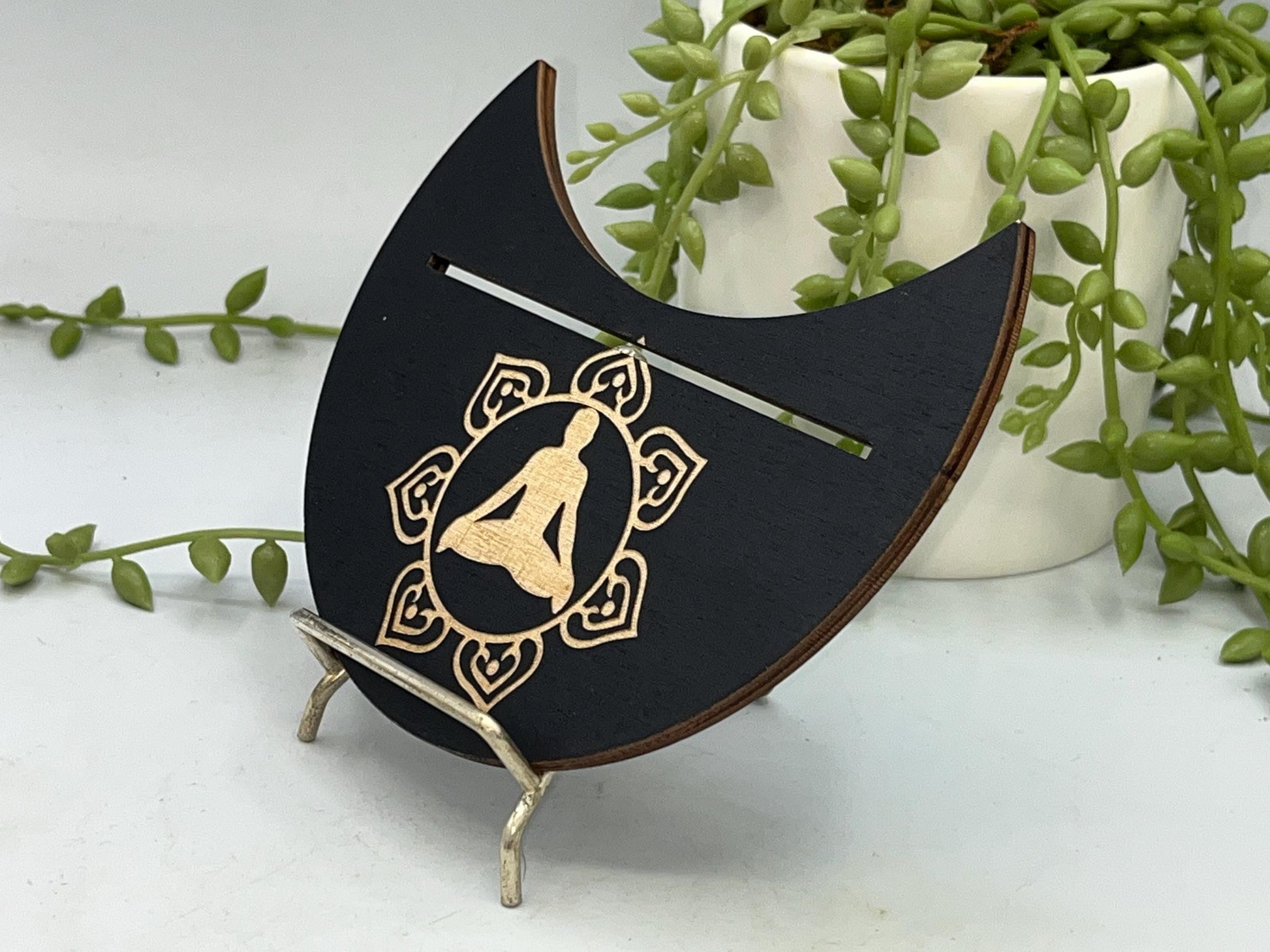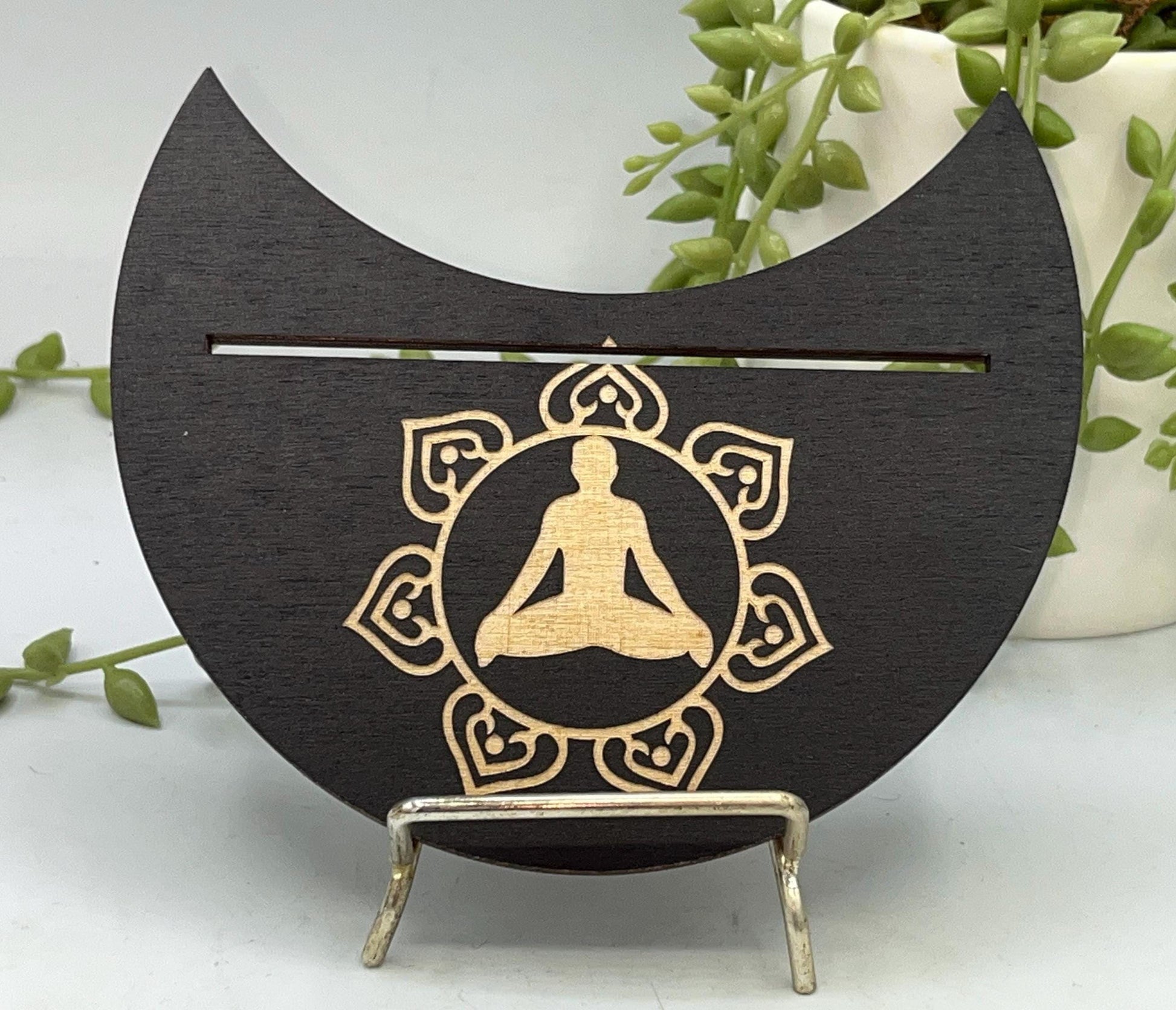 This particular design is made in a crescent moon shape featuring a lotus flower with a person practicing Yoga in the centre symbol displayed on the top. The slot can fit two smaller cards or one larger card depending on your deck size.