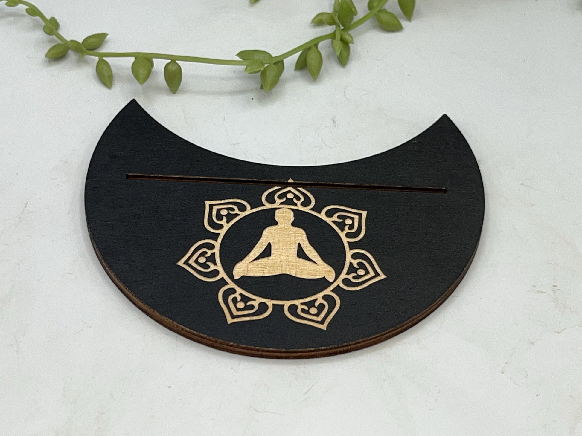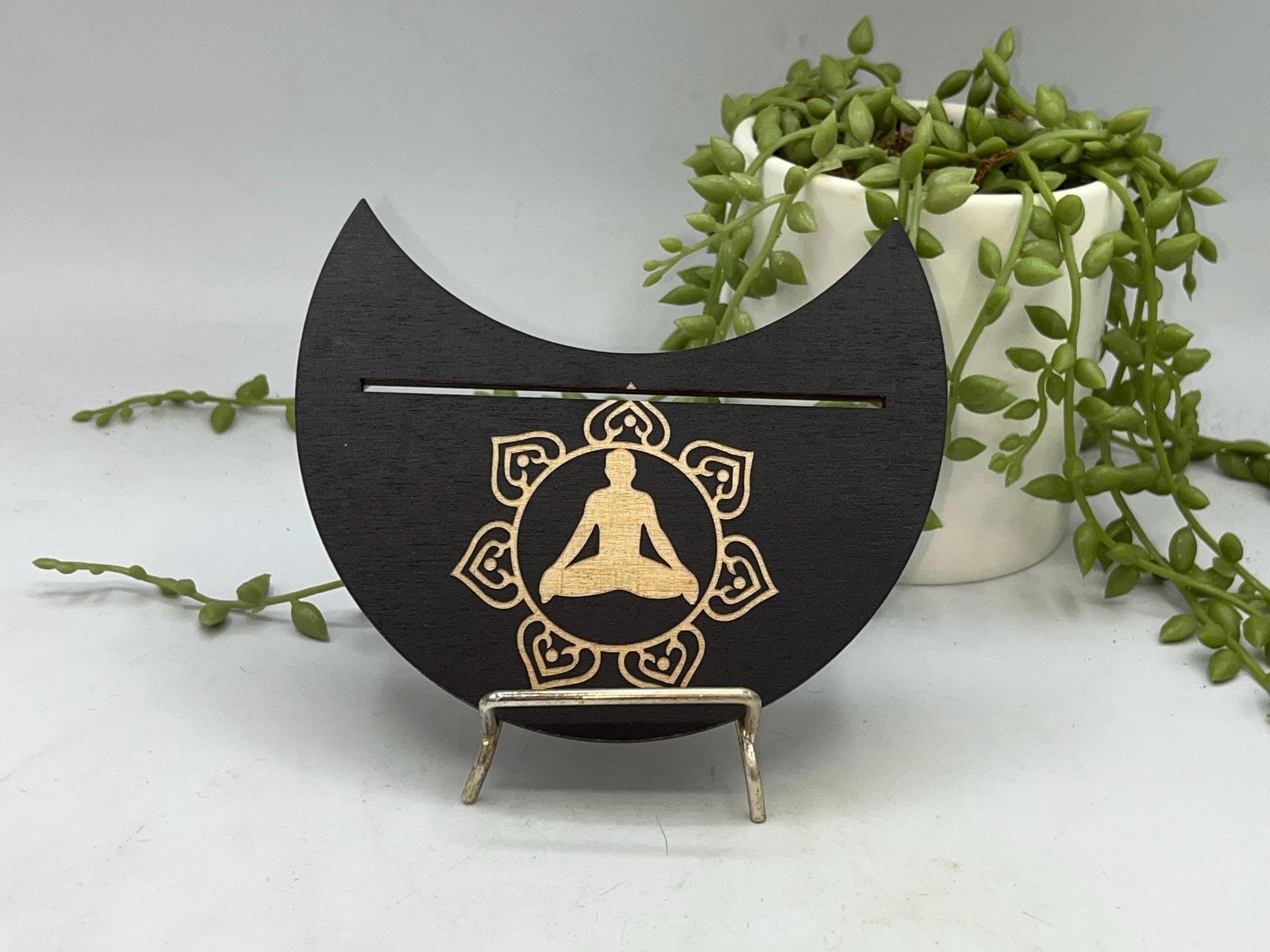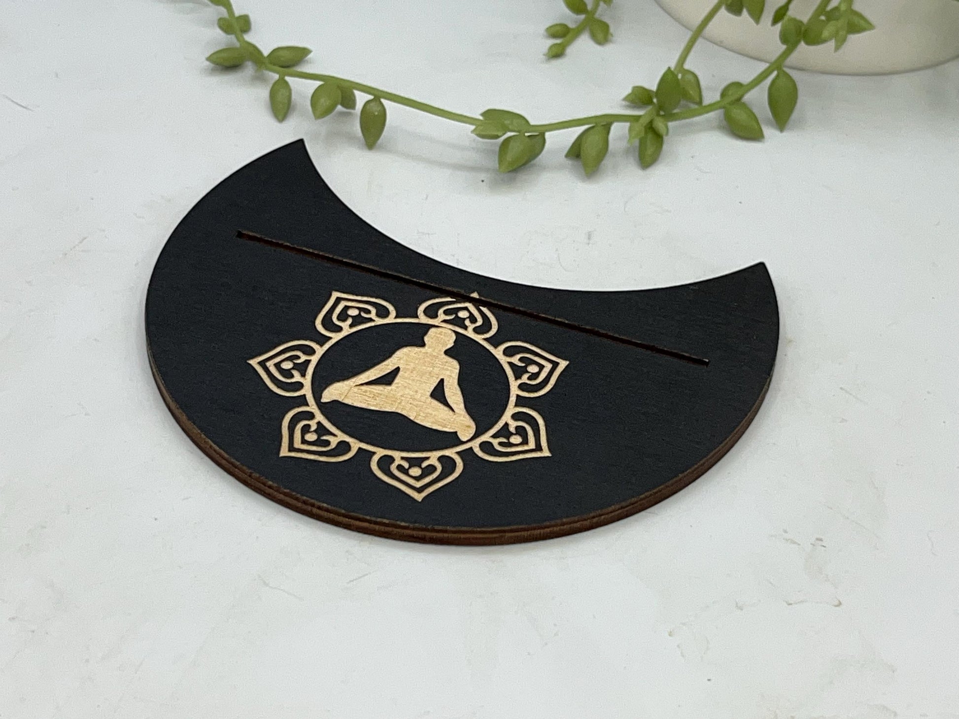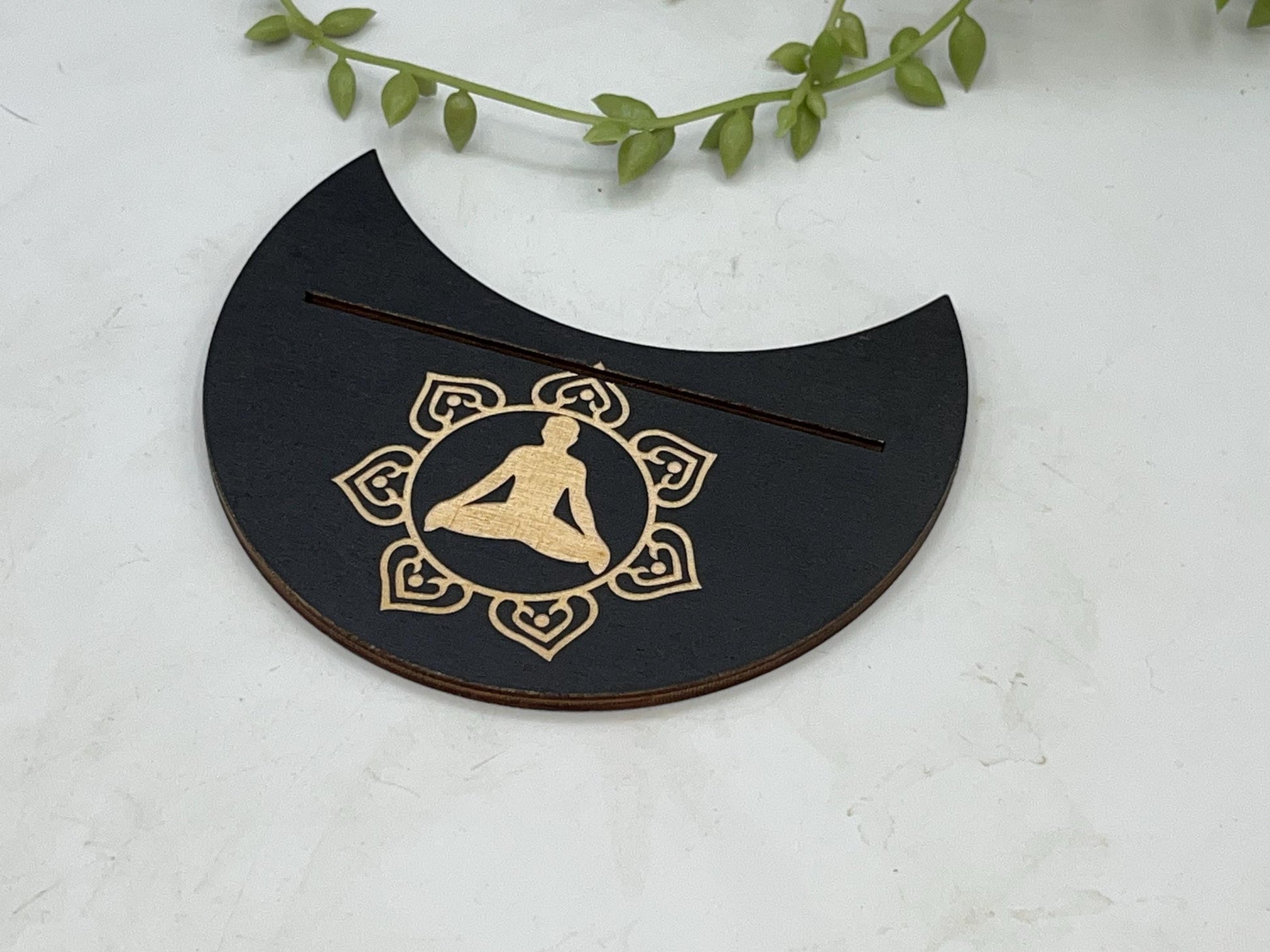 This particular design is made in a crescent moon shape featuring a lotus flower with a person practicing Yoga in the centre symbol displayed on the top. The slot can fit two smaller cards or one larger card depending on your deck size.