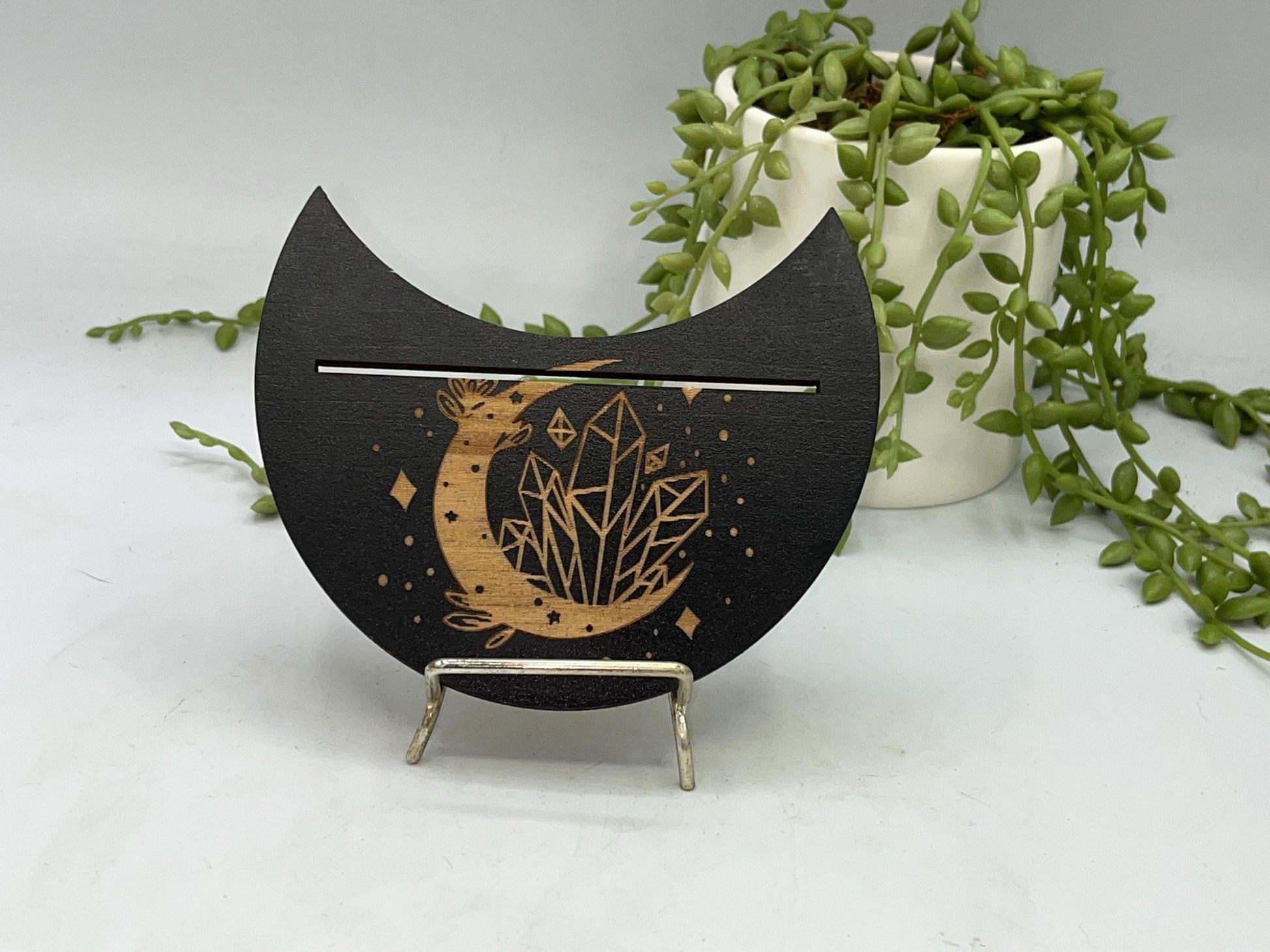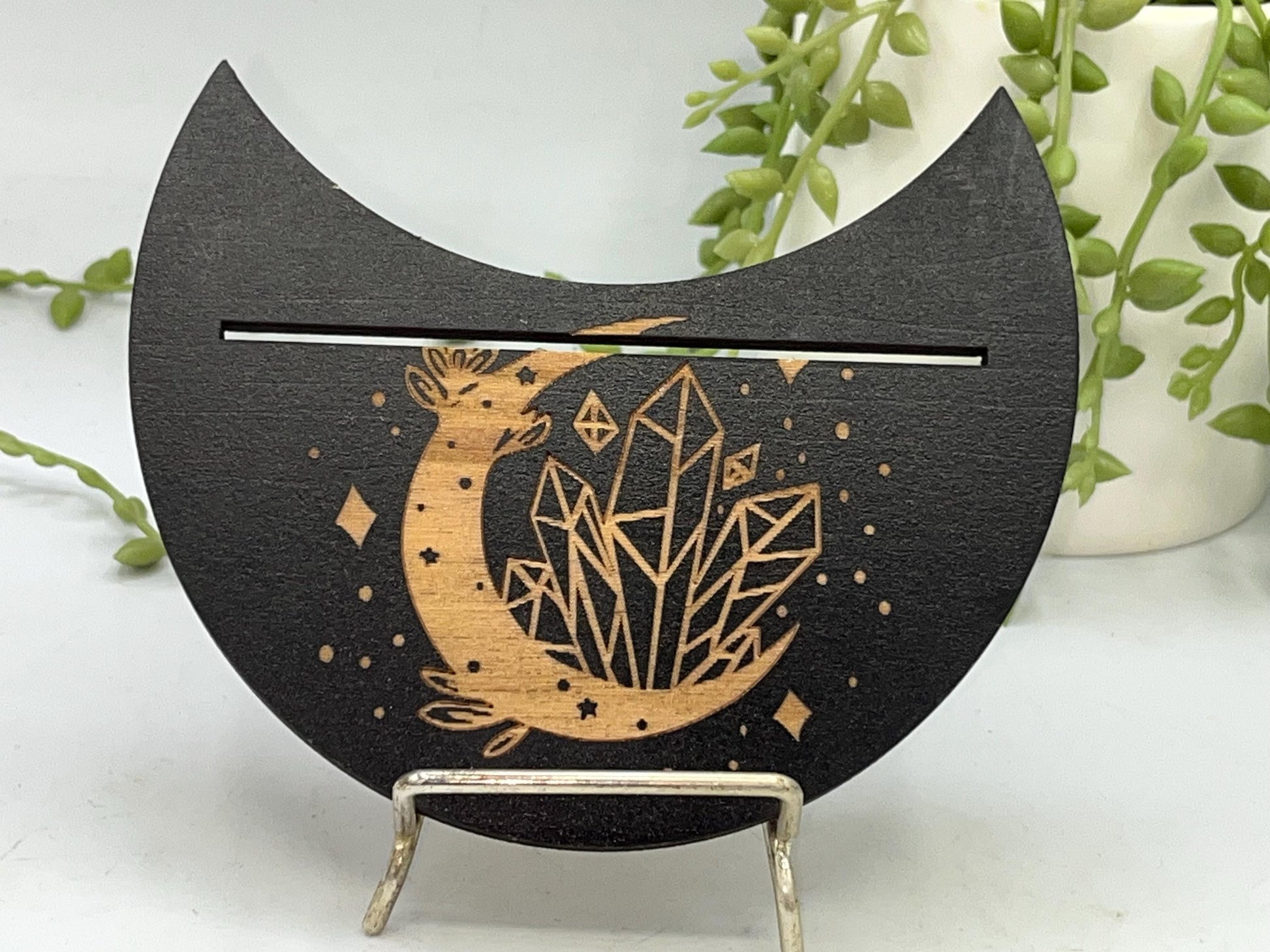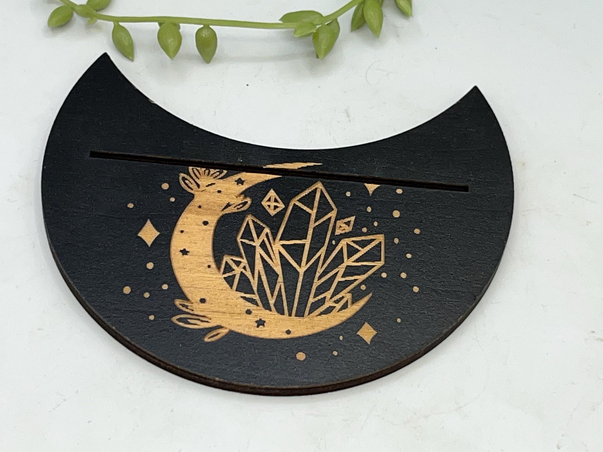 This particular design is made in a crescent moon shape with a crescent moon with crystal pattern displayed on the top. The slot can fit two smaller cards or one larger card depending on your deck size.