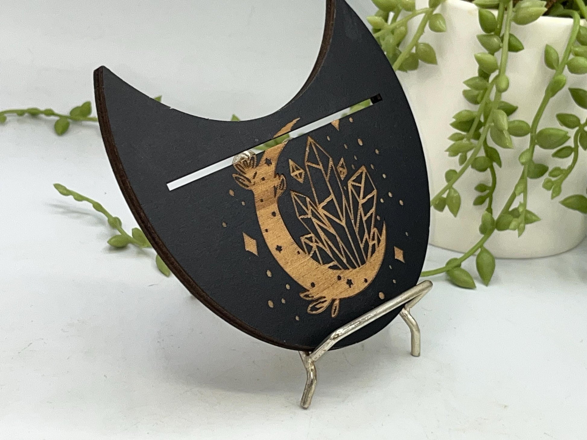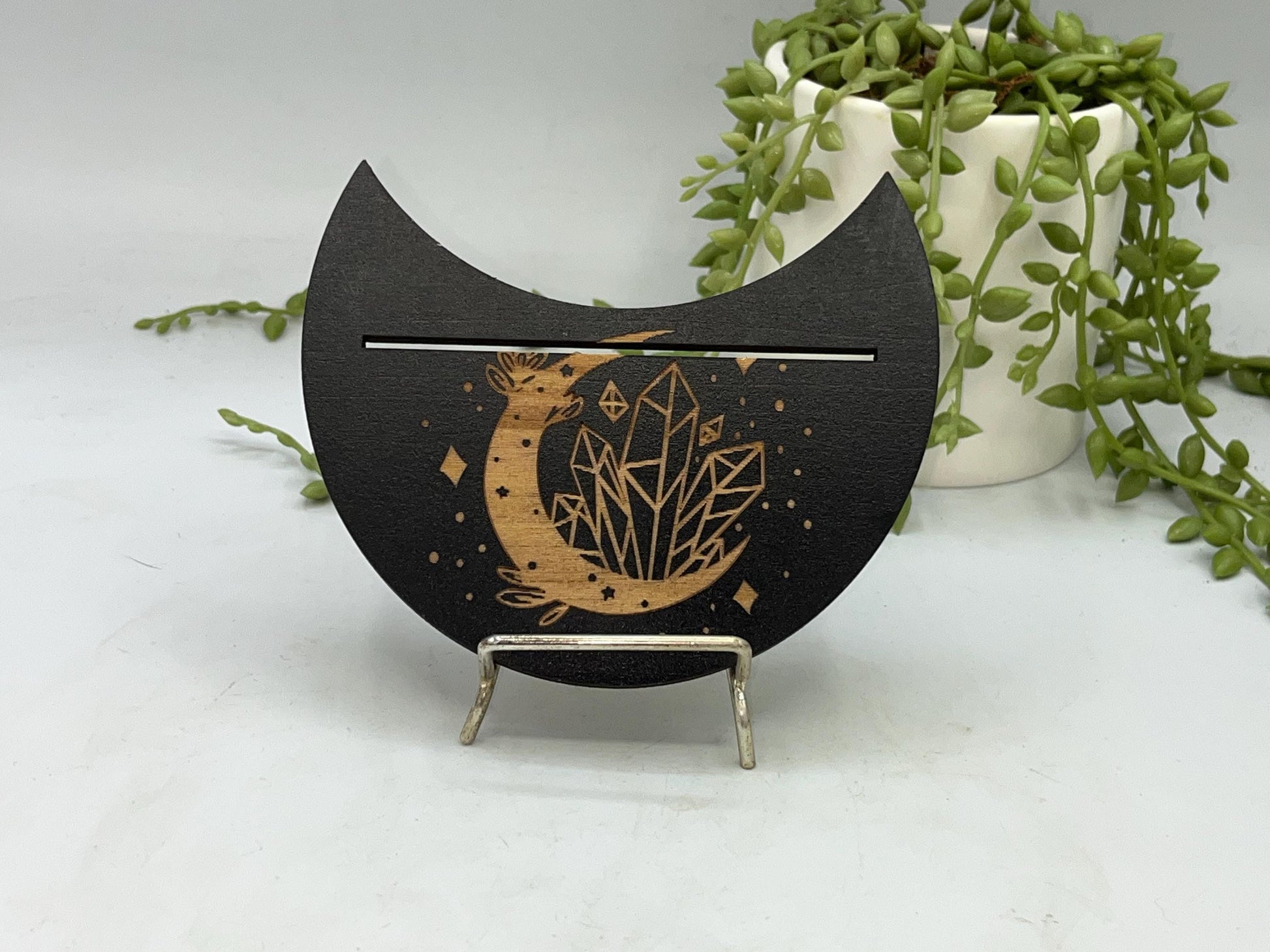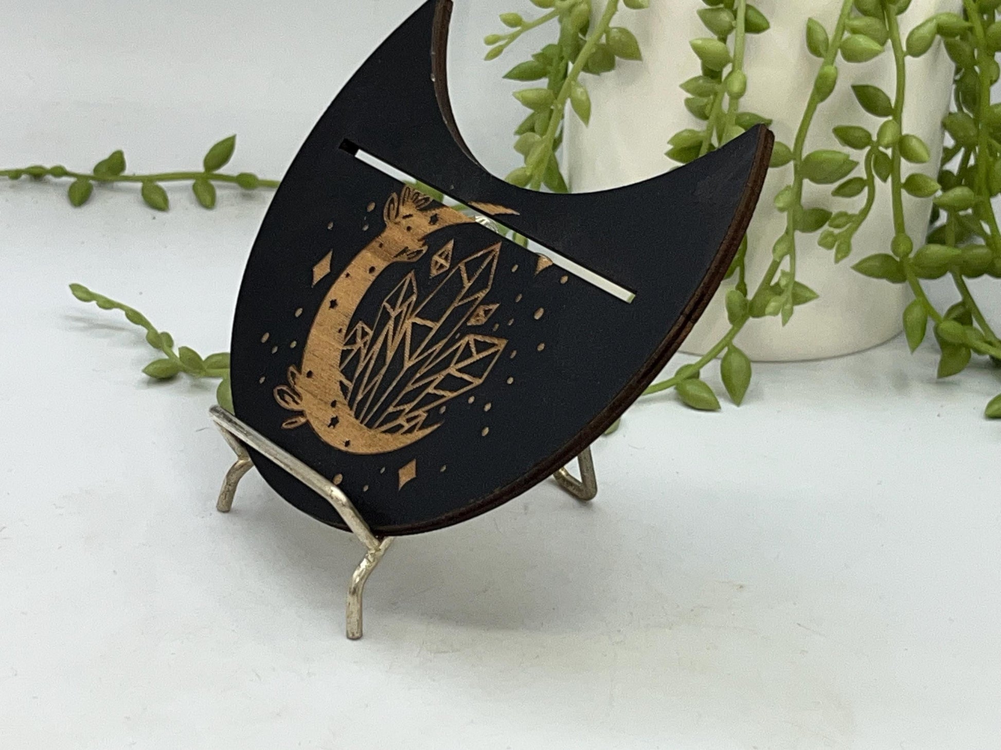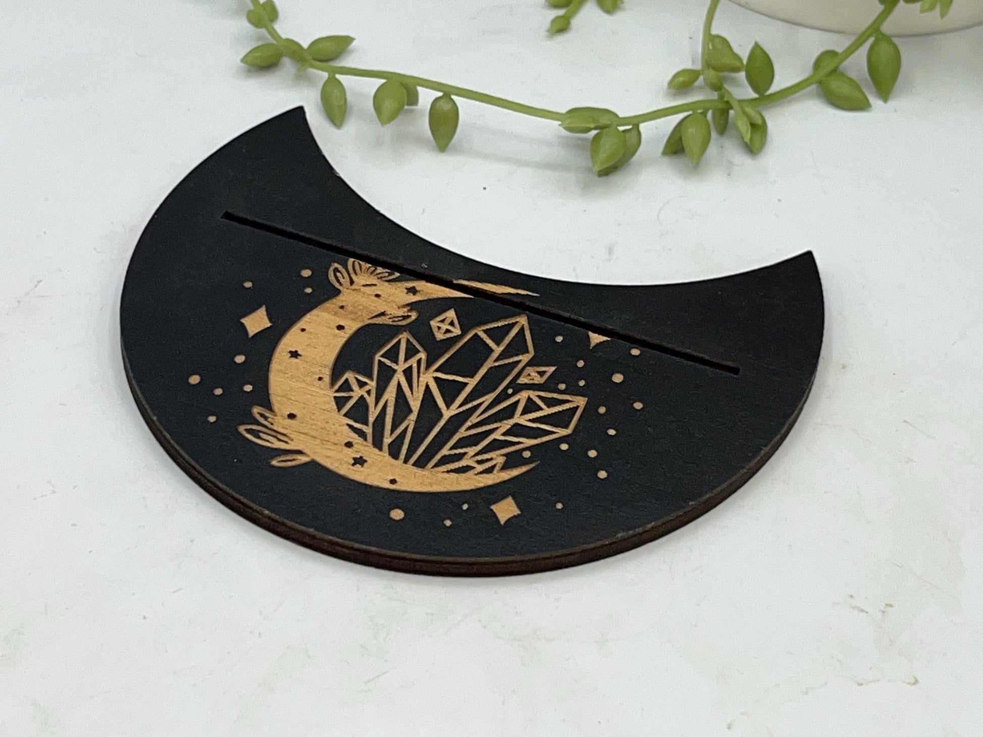 This particular design is made in a crescent moon shape with a crescent moon with crystal pattern displayed on the top. The slot can fit two smaller cards or one larger card depending on your deck size.