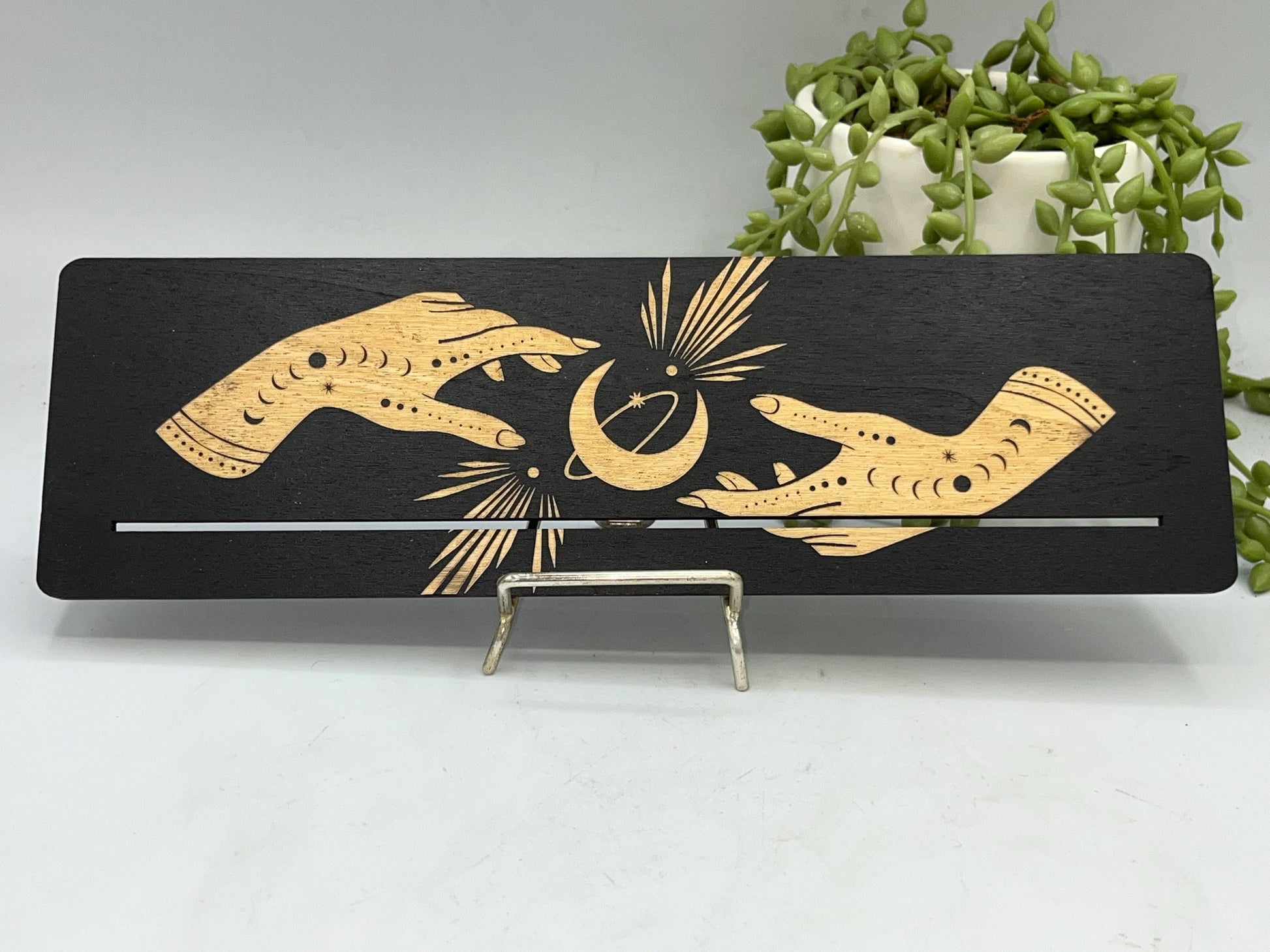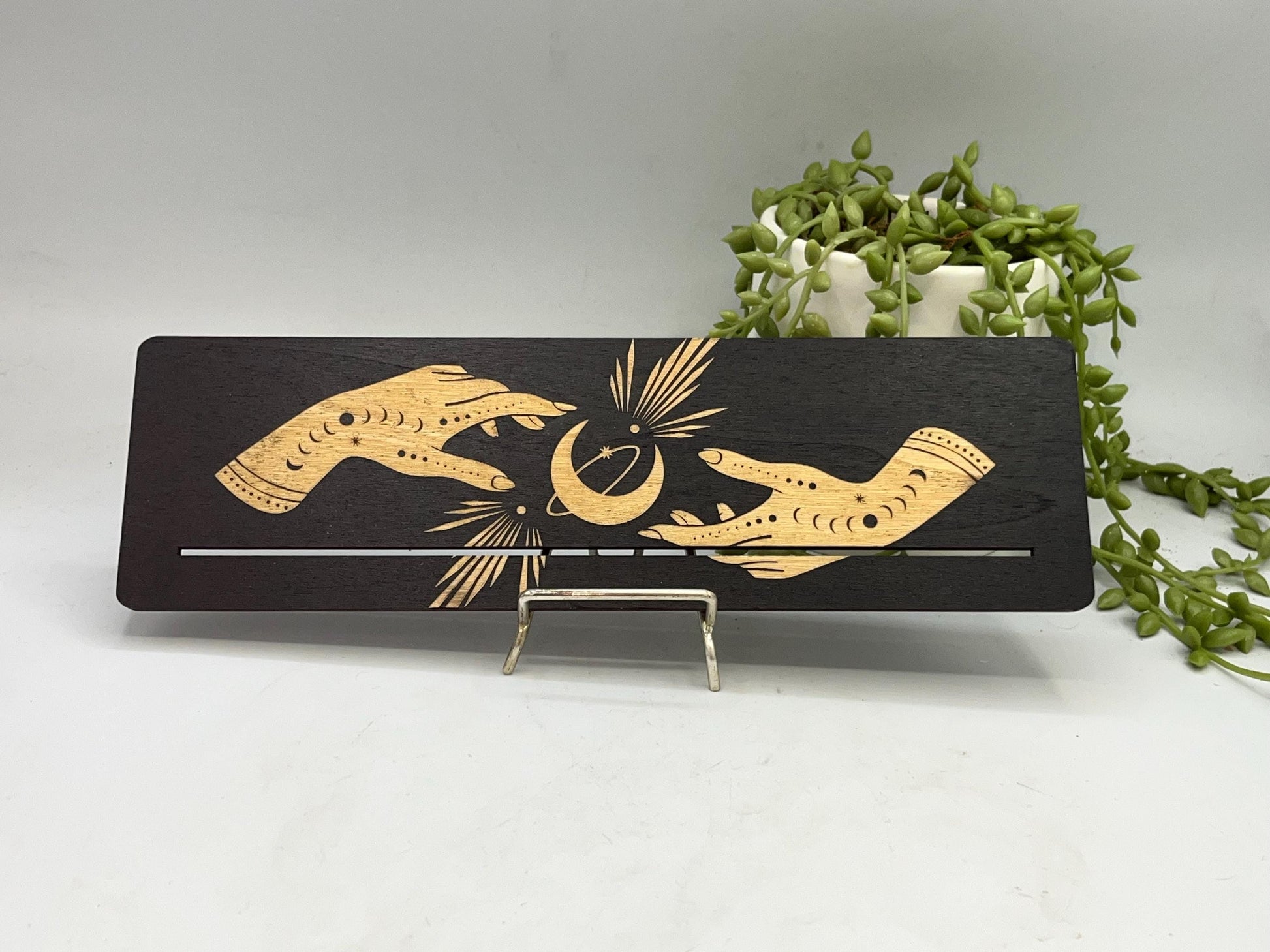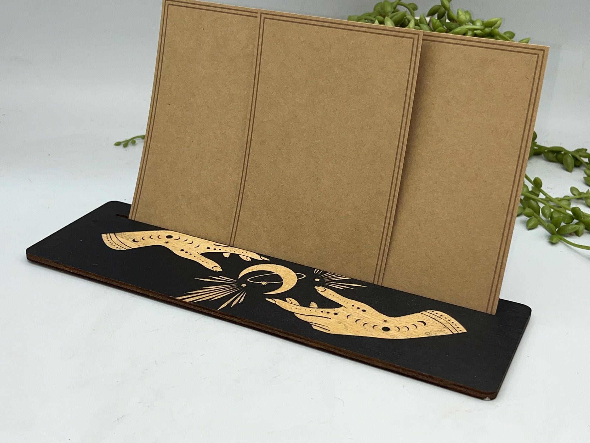 Tarot cards of the day 3 card holder. Wooden mystical hands reaching for the moon tarot/oracle card holder, altar stand, card of day