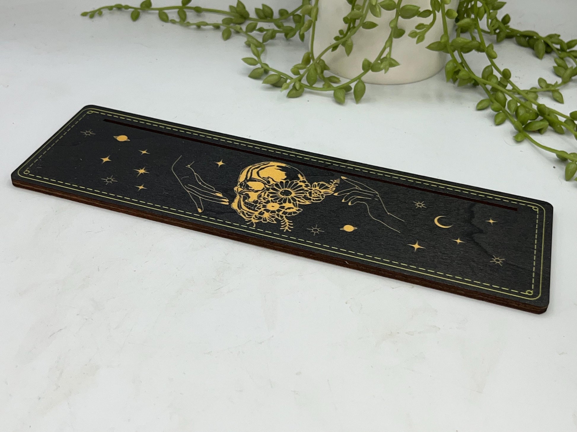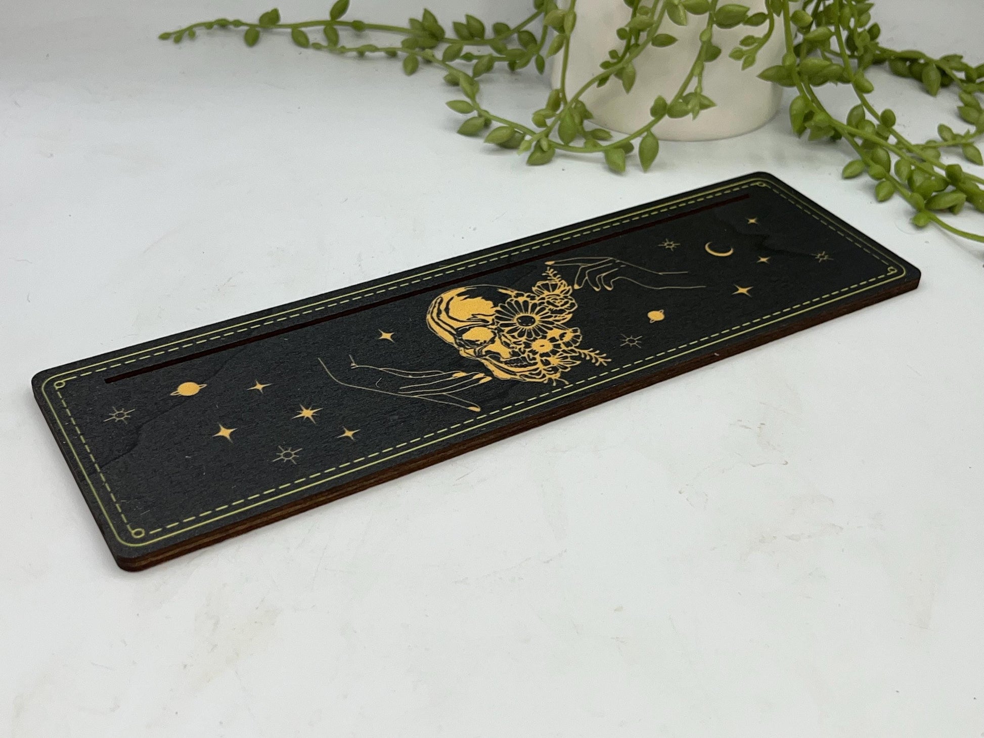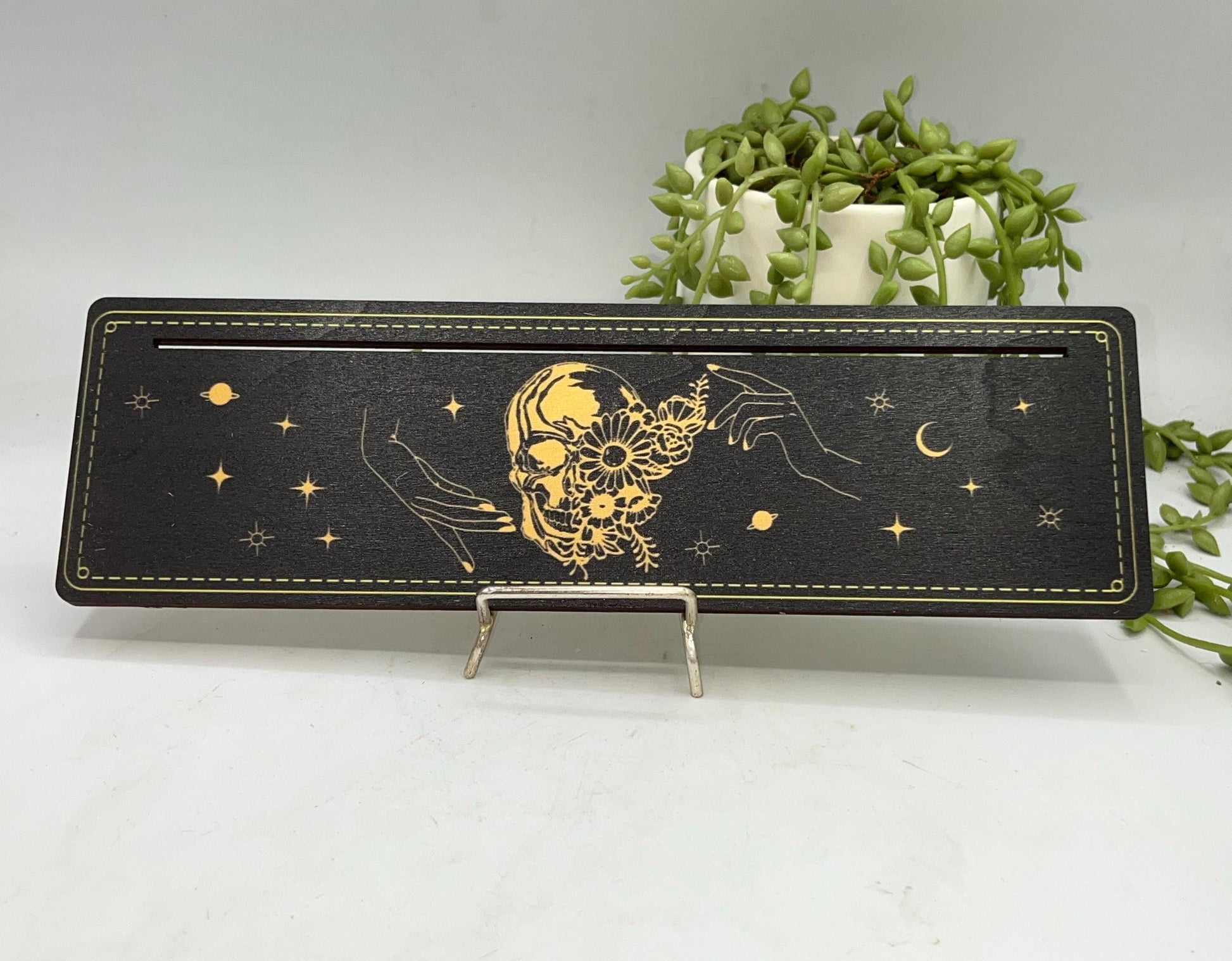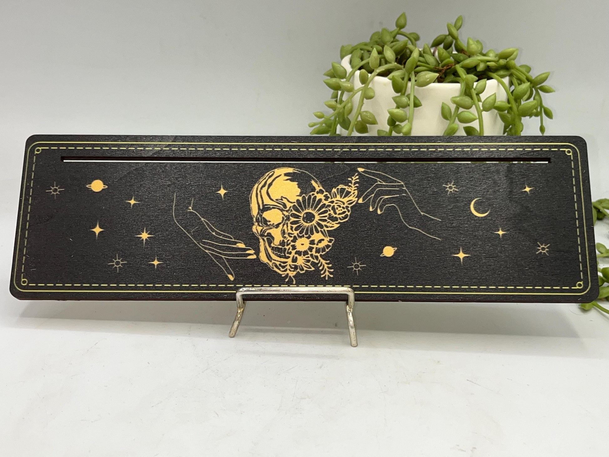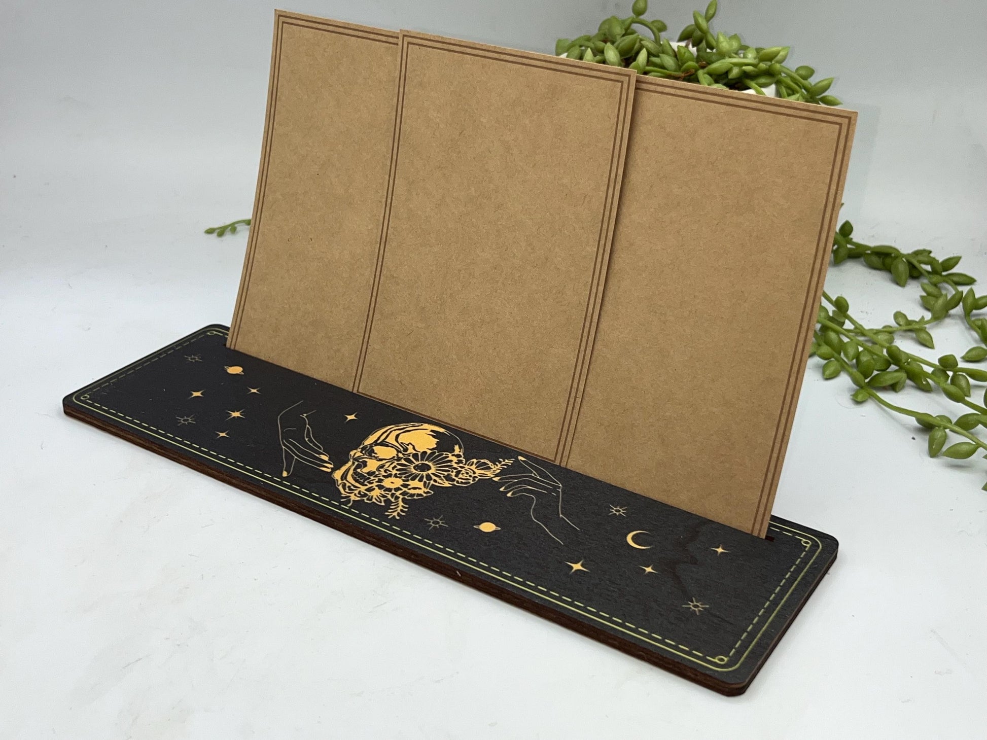 Tarot cards of the day 3 card holder. Wooden skull design with hands, flowers, planets and stars tarot/oracle card holder, altar stand