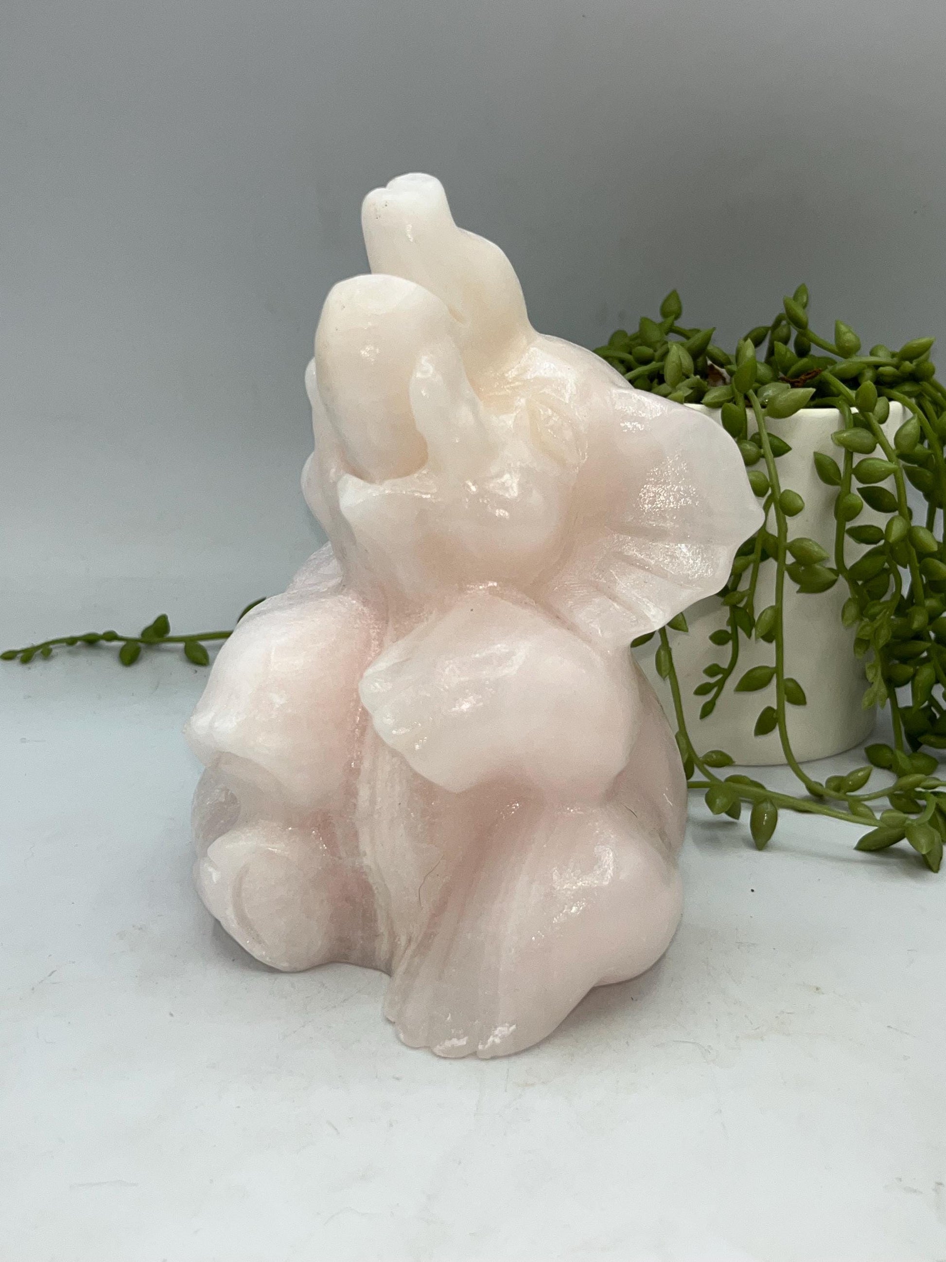 A very large lucky elephant carving in beautiful banded bright Pink Calcite. Please note that this is not a UV reactive piece of calcite, not that it matters as this elephant is a gorgeous soft hue of pink with white banding.